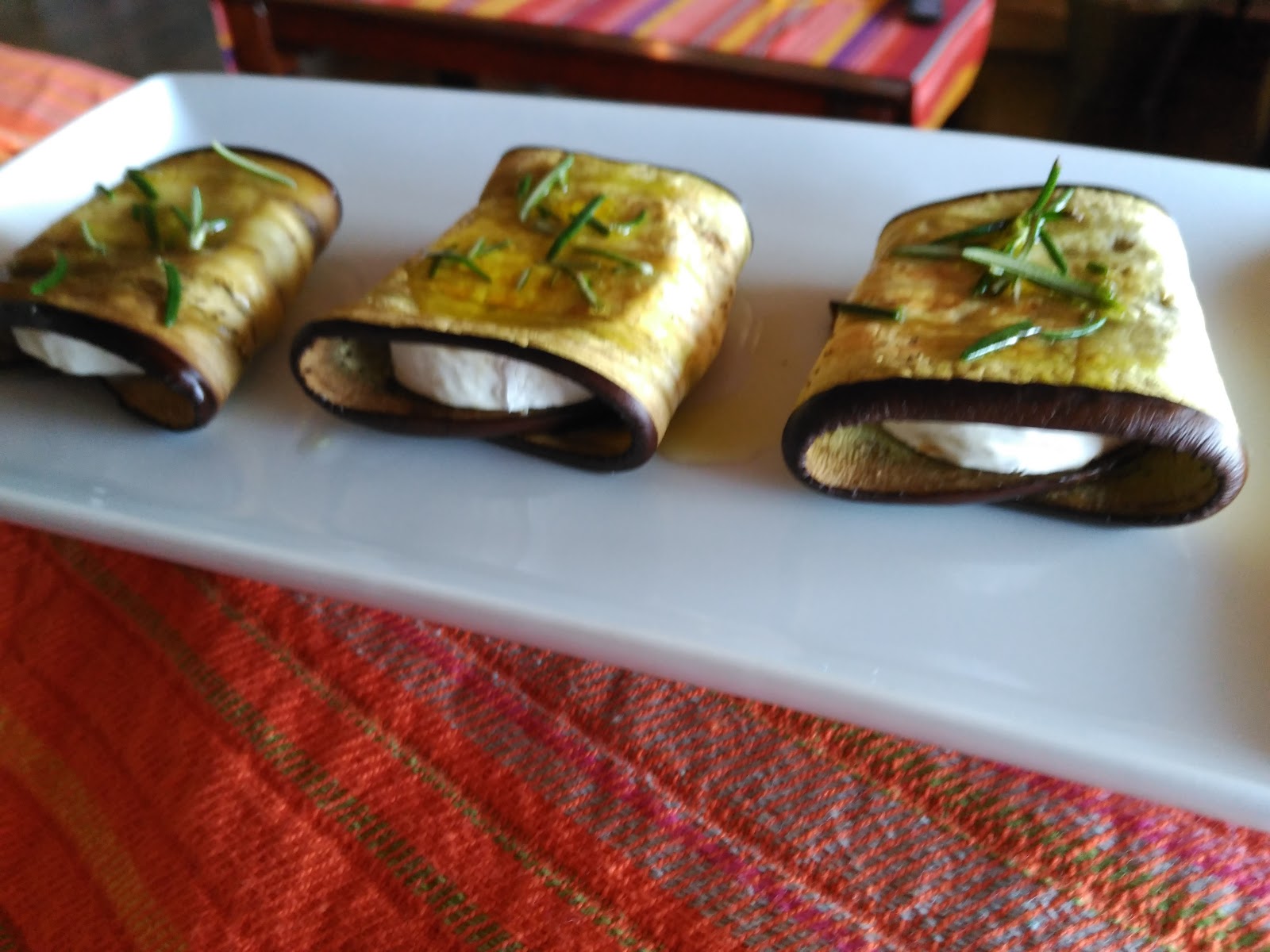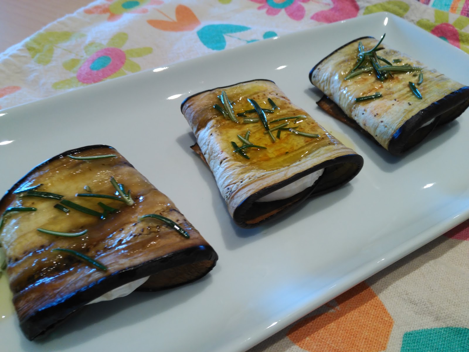 – Cortar el queso de cabra en rodajas, y enrollar cada rodaja de queso en una lámina de berenjena, colocando los paquetitos en una bandeja de horno.