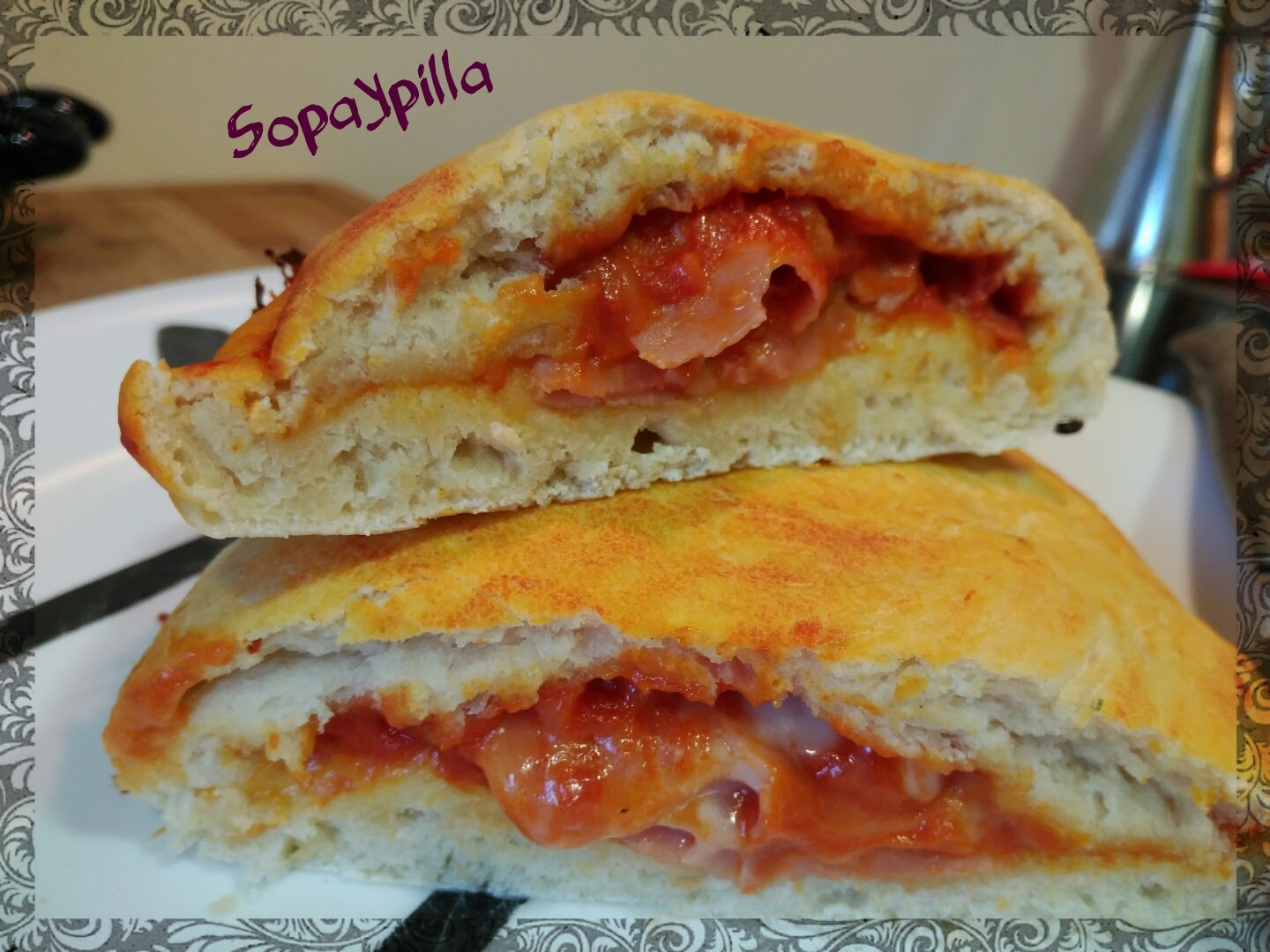 Y la tercera propuesta pizzera con la masa mágica: una calzone…es idéntica a la pizza de jamón, pero doblada, de manera que la cobertura pasa a ser relleno. He querido dedicar un post solito para ella, porqué os la quiero recomendar mucho, mucho…el sabor es diferente, es más crujiente y queda más empapada en los sabores del tomate y el jamón (o lo que queráis poner).