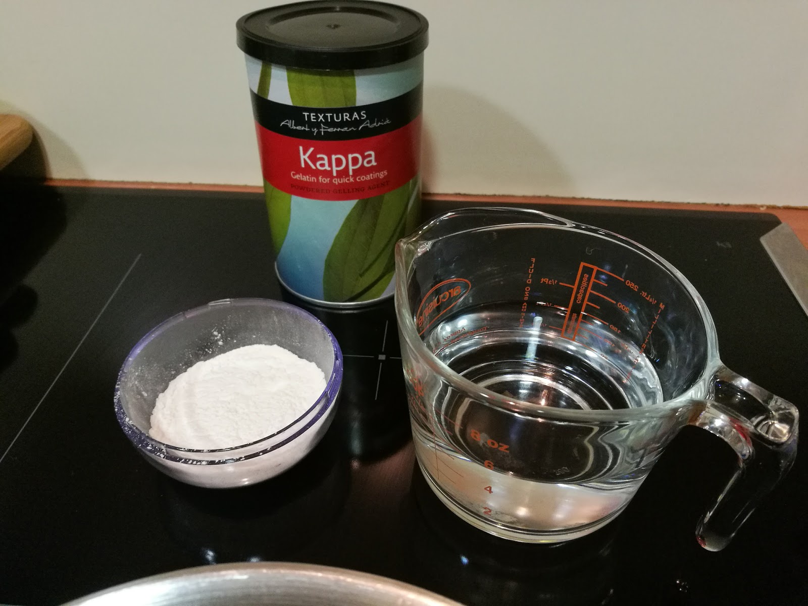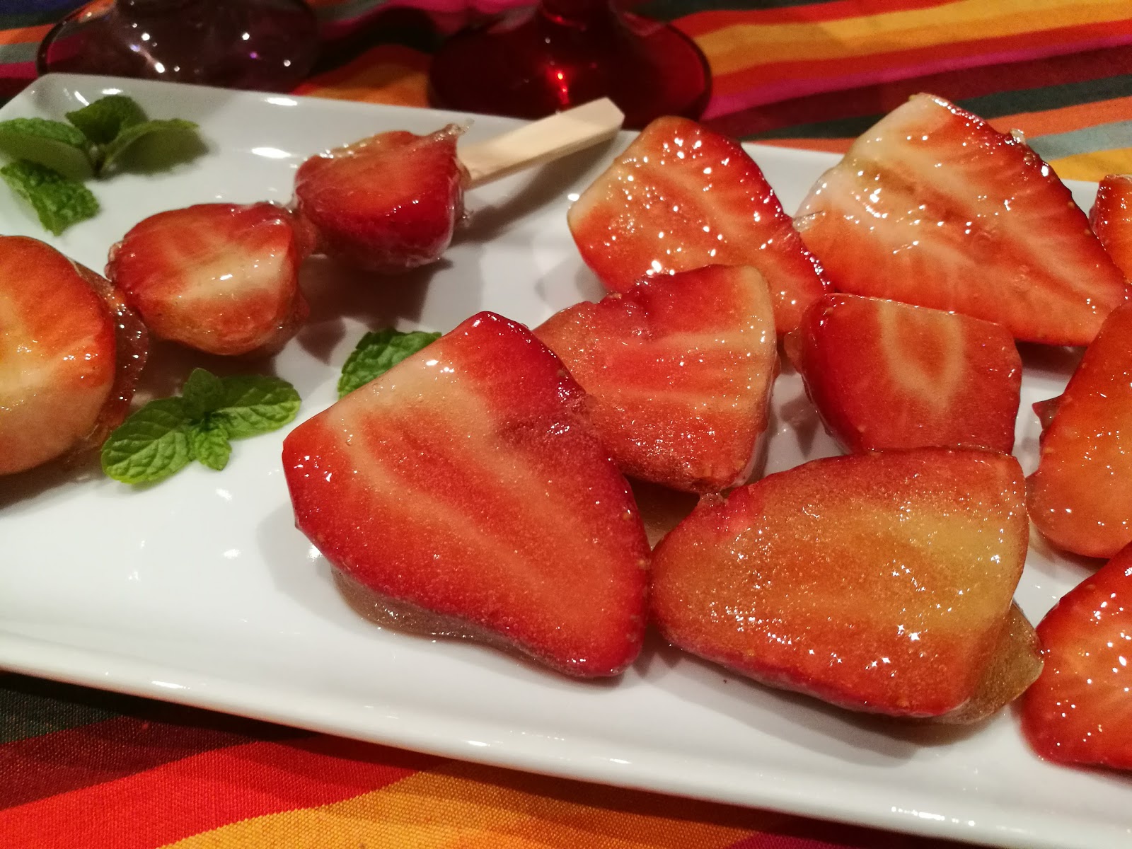 Fresas con gelatina de miel: 250g. miel de romero, 200g. agua, 5g. kappa, 400g. fresas