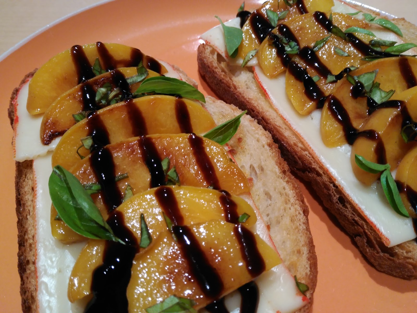 – Montamos el crostini, poniendo las lonchas de queso sobre el pan, el melocotón y la albahaca picada.
