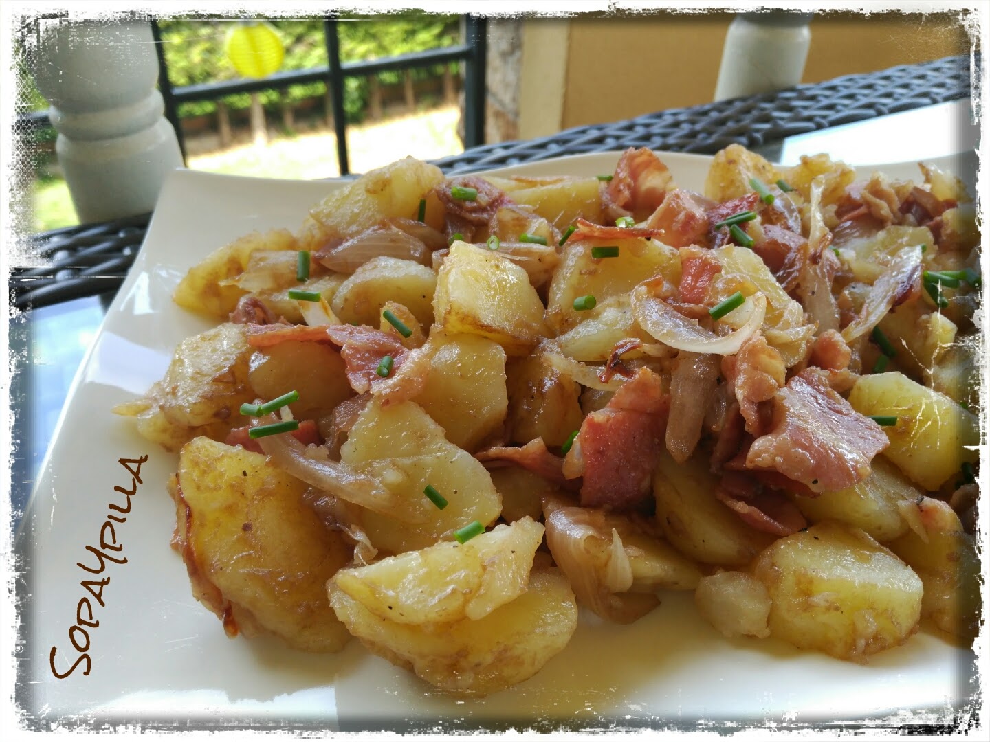 – En una sartén con muy poco aceite, sofreímos la cebolla cortada en juliana y el bacon, hasta que la cebolla esté transparente y el bacon crujiente.