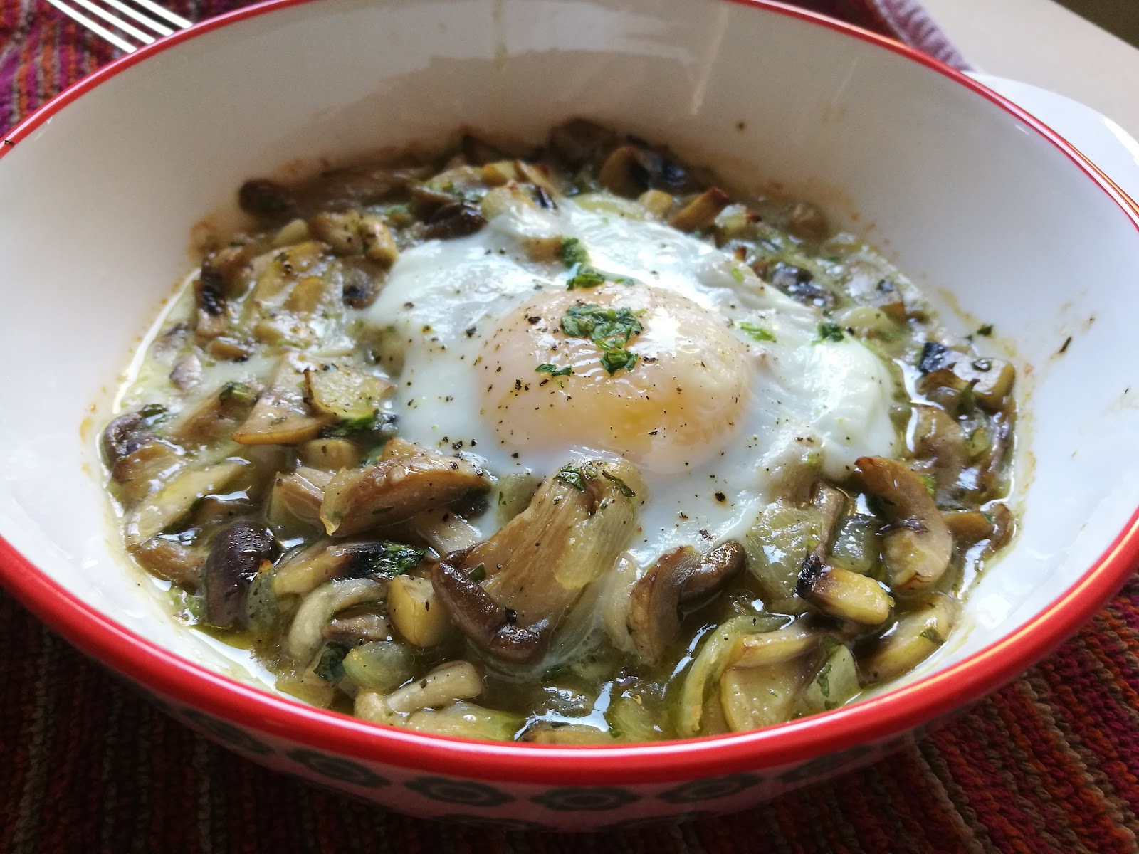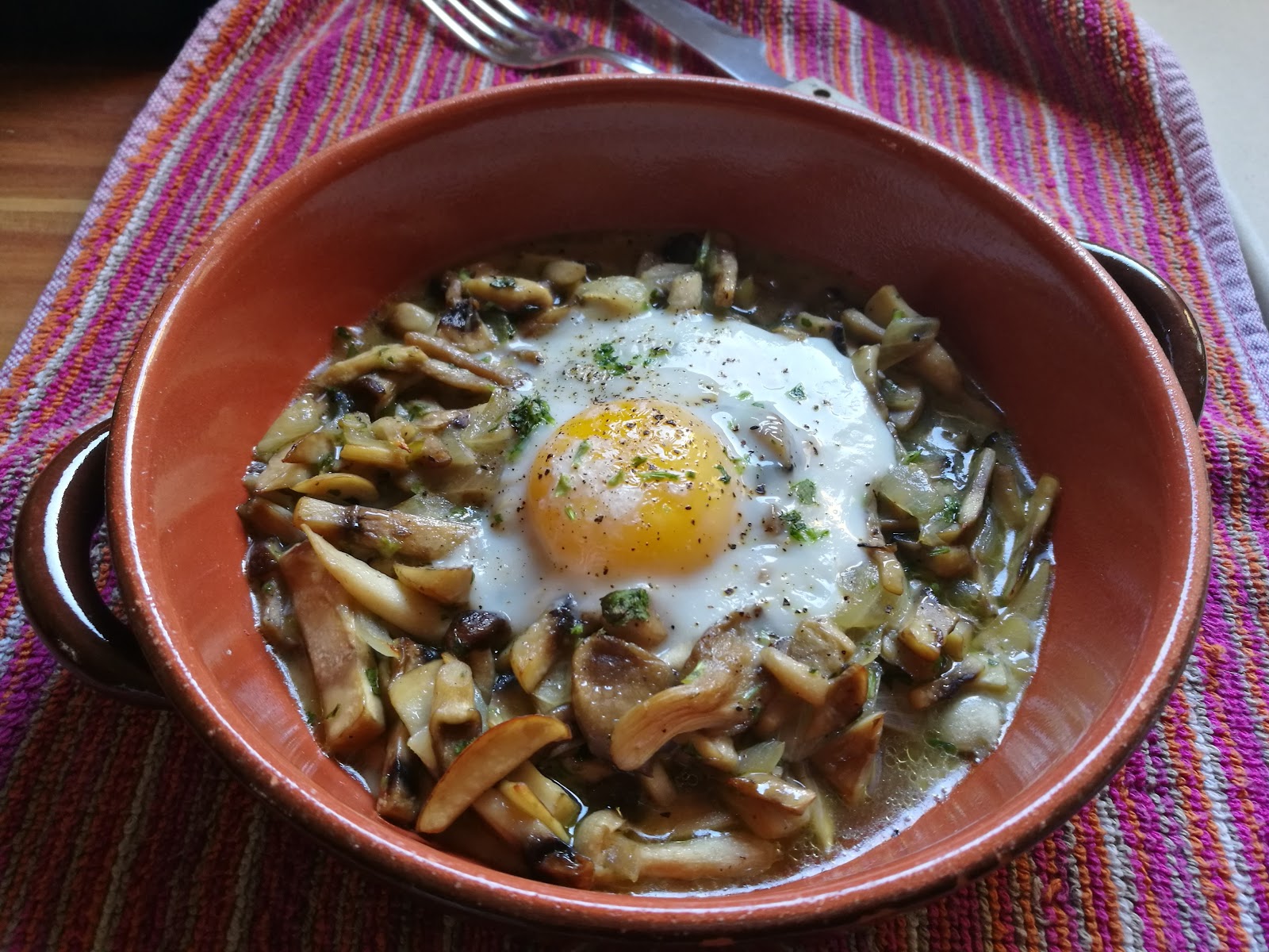– Poner un huevo encima de cada cazuelita, salar y hornear (180º) unos minutos. Sacar cuando veáis que la clara empieza a estr blanca, para que la yema continúe sin cocer.