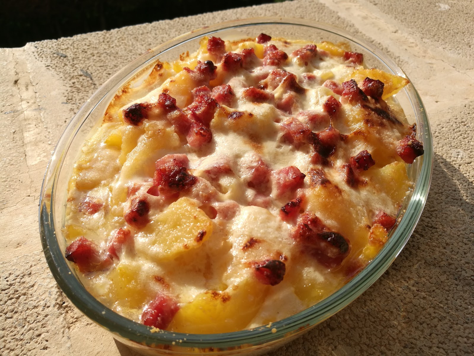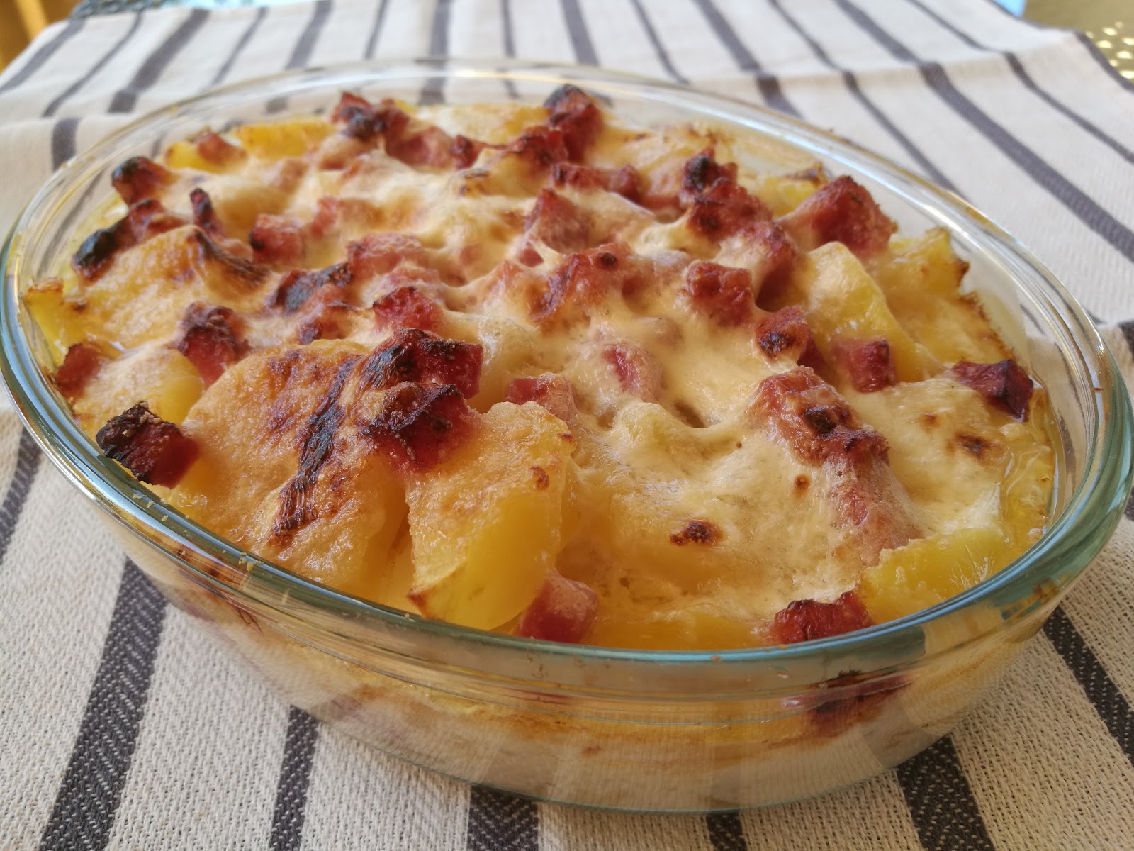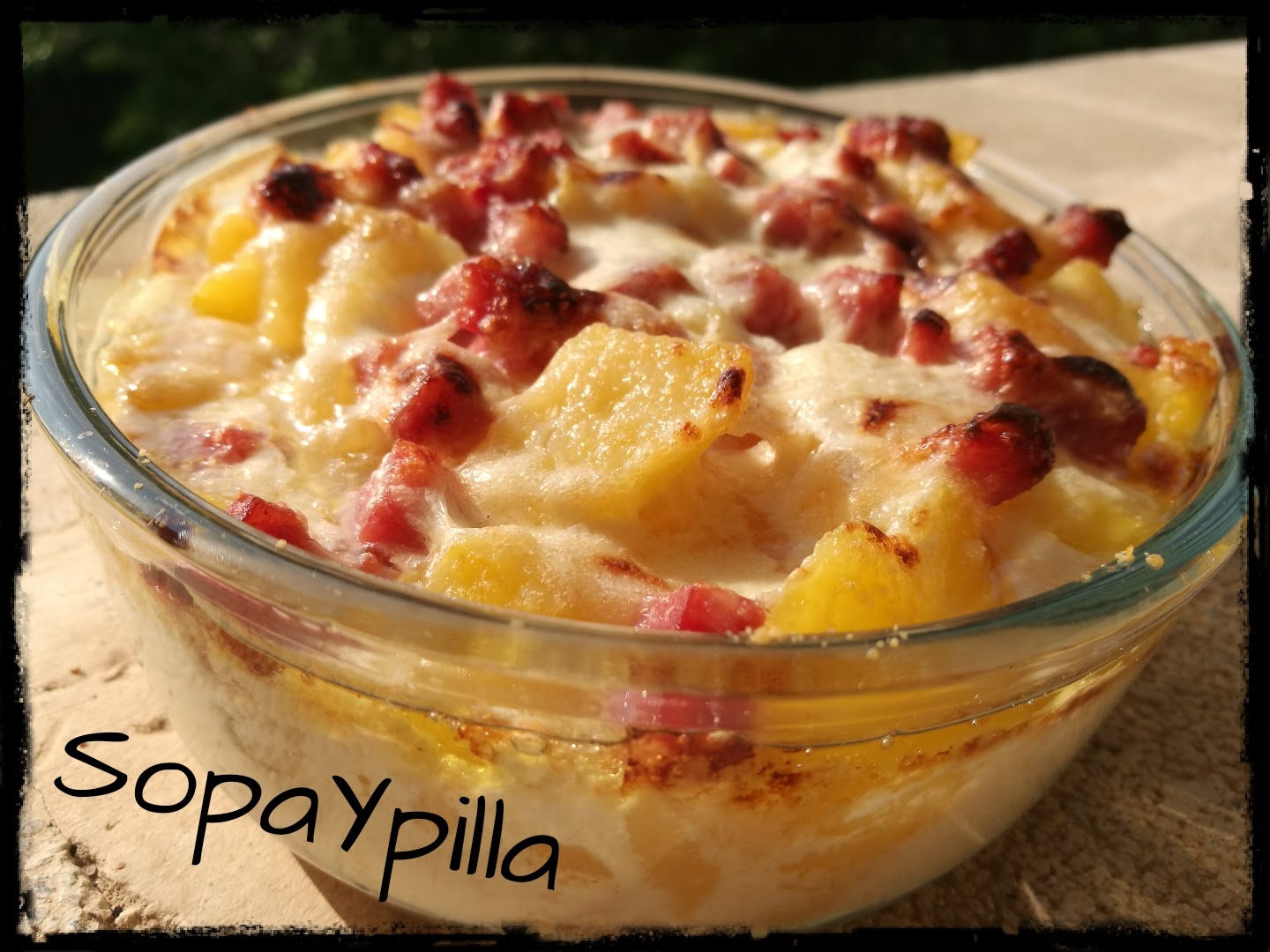 – En una fuente refractaria vamos haciendo capas: patatas, jamón, queso y nata, así sucesivamente hasta rellenar la fuente, regar con la mantequilla y gratinar en el horno unos minutos.