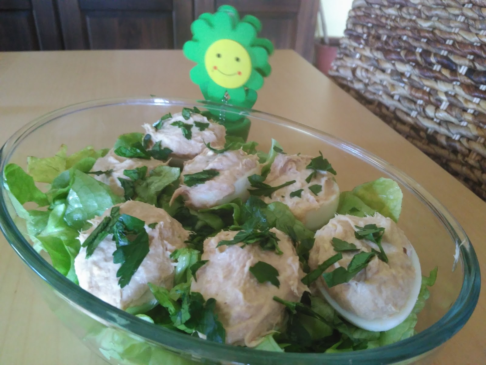 – Colocamos los huevos rellenos con la mezcla que hemos preparado y espolvoreamos el perejil picado.