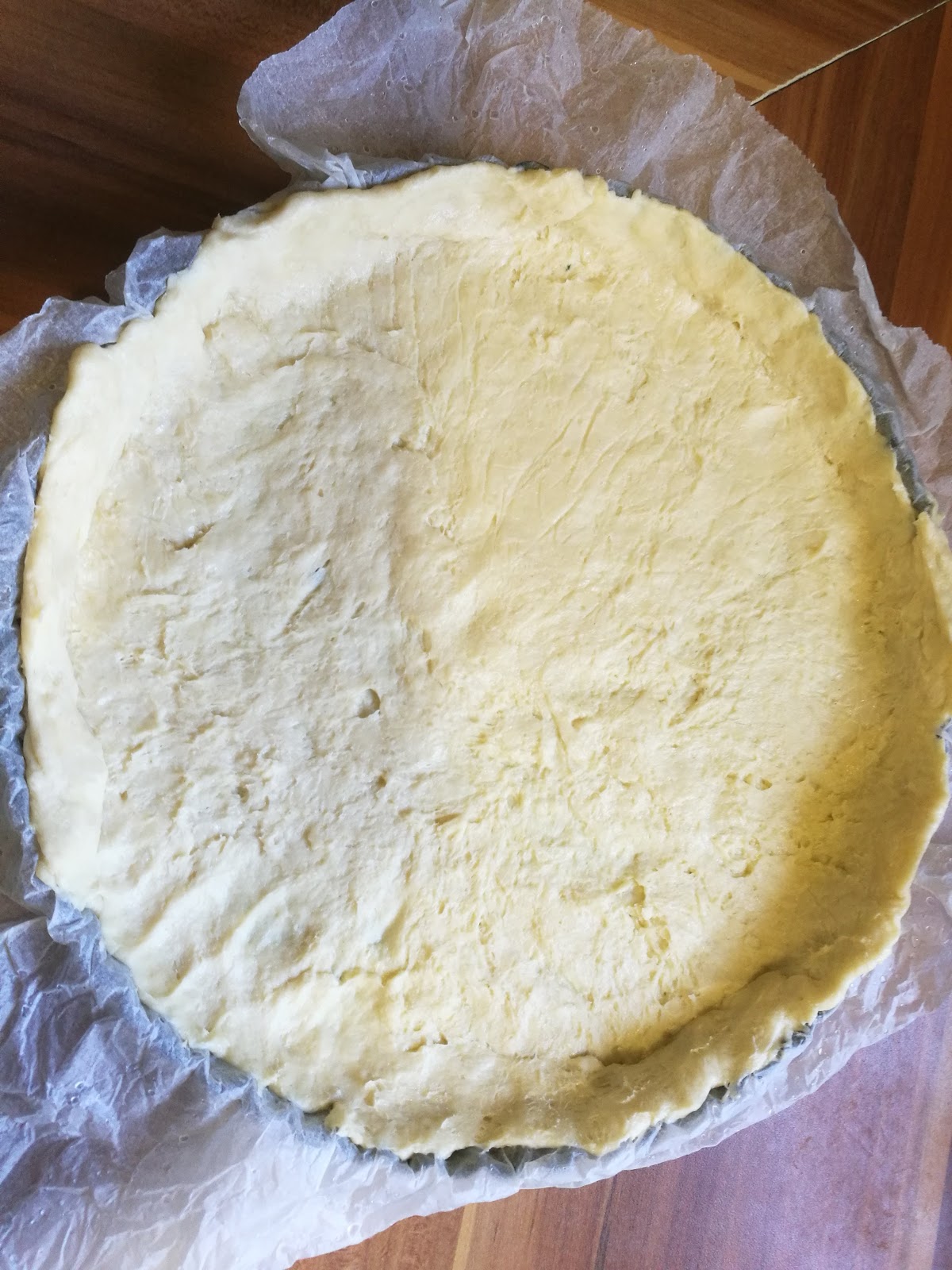 – Alisamos la masa en círculo y cubrimos con ella un molde desmontable, cubriendo también los bordes