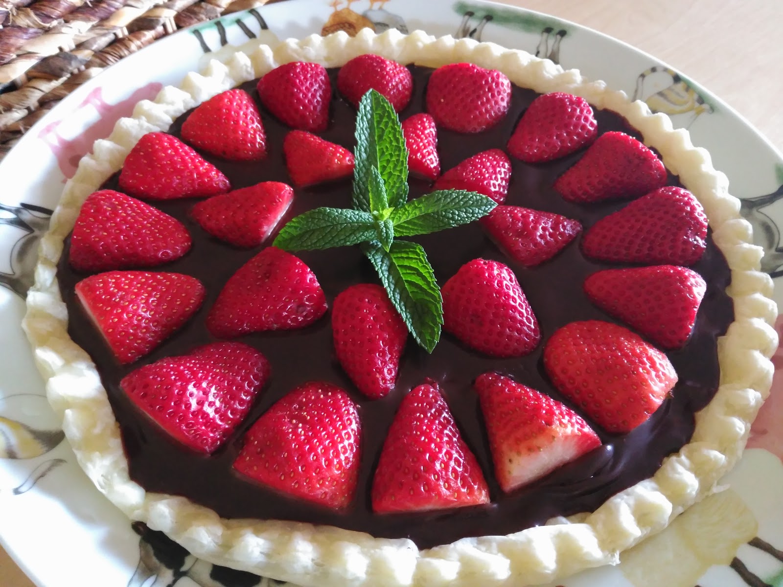 – Bañar la tarta con el chocolate, dejar templar un poco y colocar las fresas por encima, a mitades. Reservar en la nevera unas 2 horas, hasta solidificar el chocolate.