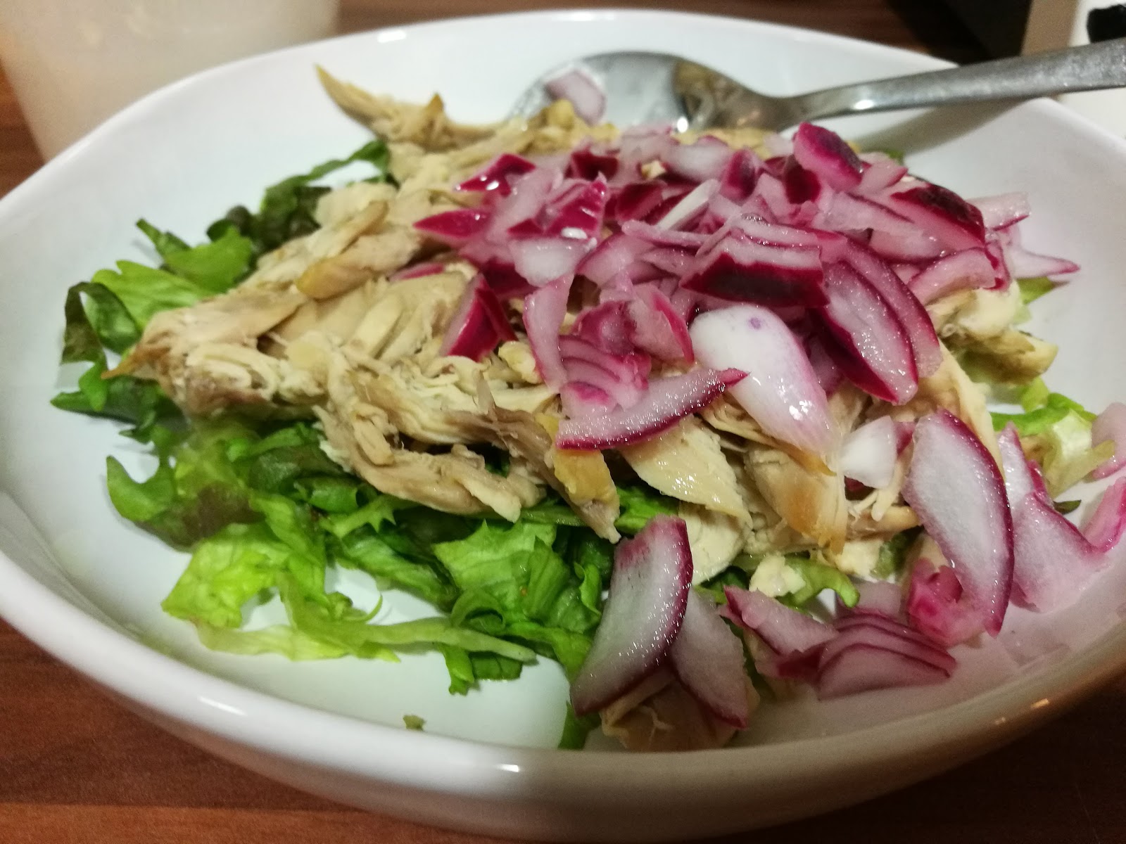 – Mezclar el pollo troceado, la mayonesa, la lechuga con un poquito de sal y la cebolla