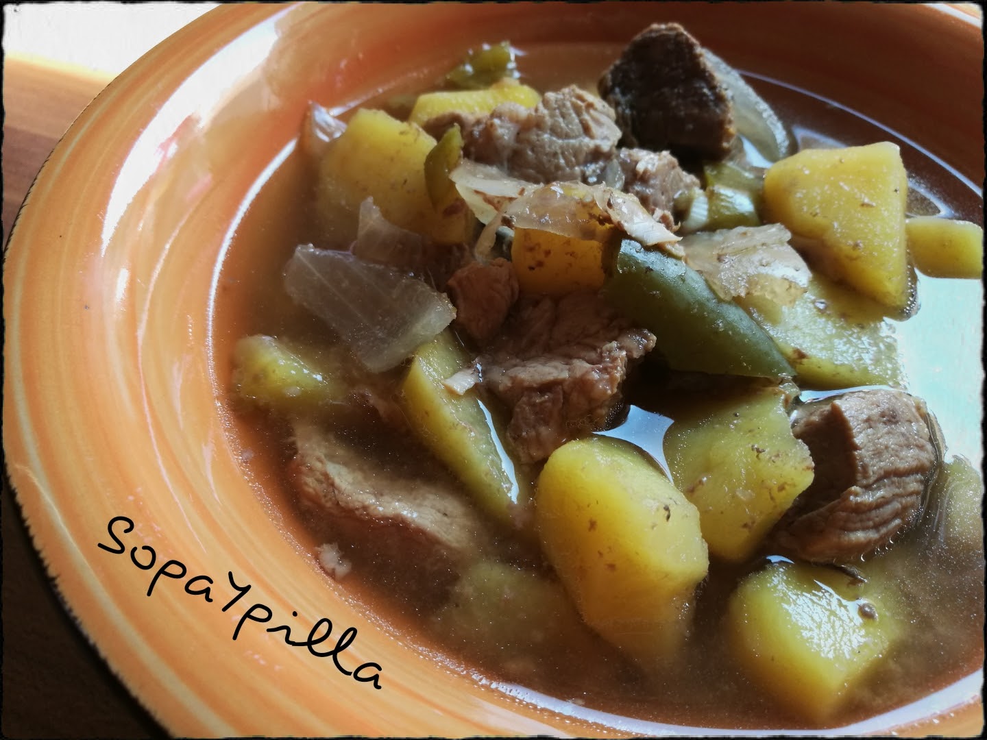 – Poner la carne salpimentada en la olla, las patatas chascadas, el pimiento troceado, y el resto de ingredientes