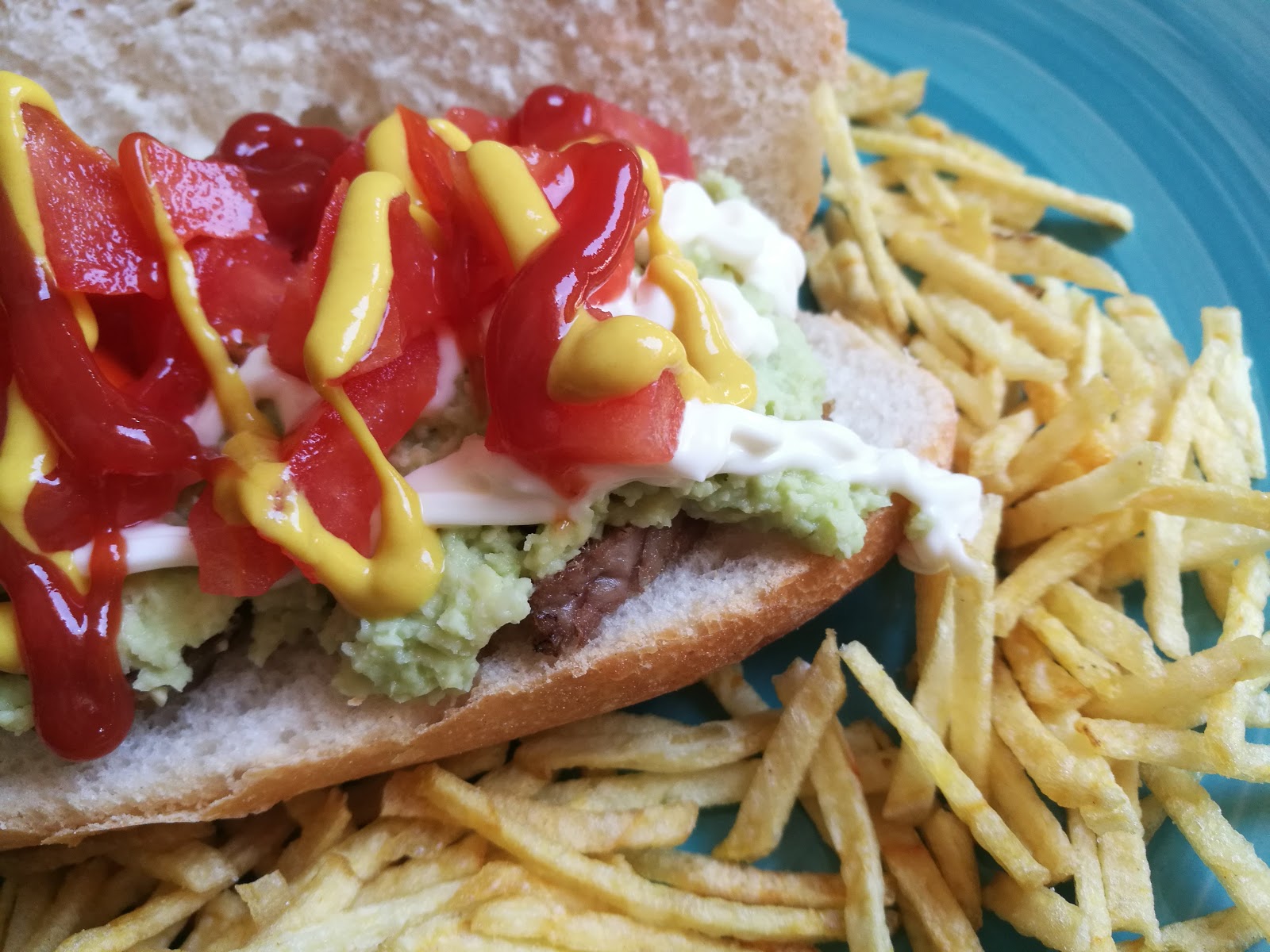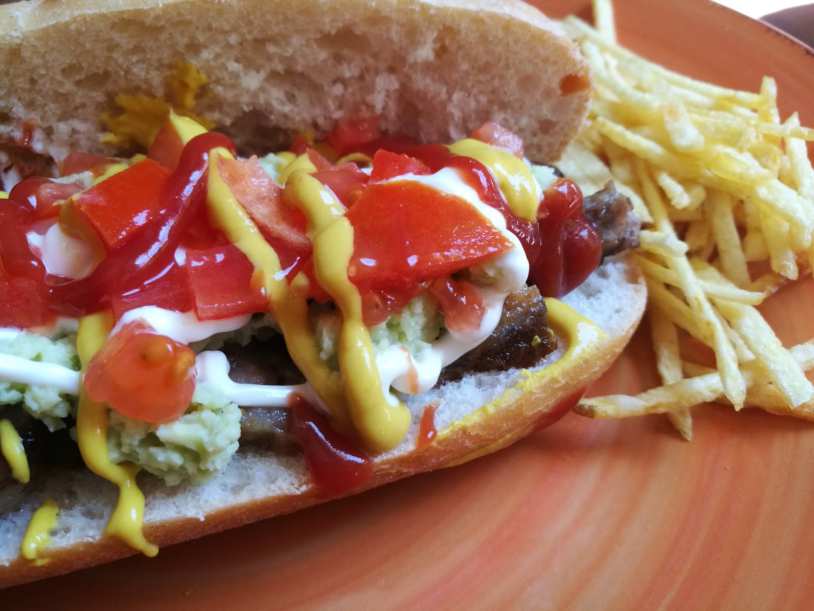 – Abrimos el pan y ponemos primero la carne de churrasco, luego en aguacate, la mayonesa, el tomate picado, y si os gusta decoramos con el ketchup y la mostaza…A disfrutar!!