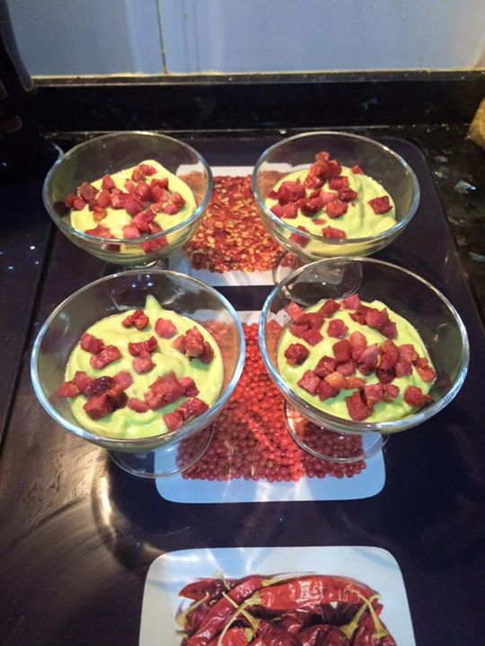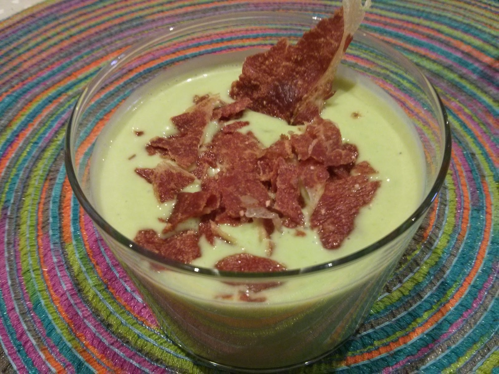 – Poner todos los ingredientes menos el jamón en el vaso de la batidora y batir bien. Servir decorando con el jamón, que habrá quedado crujientito.