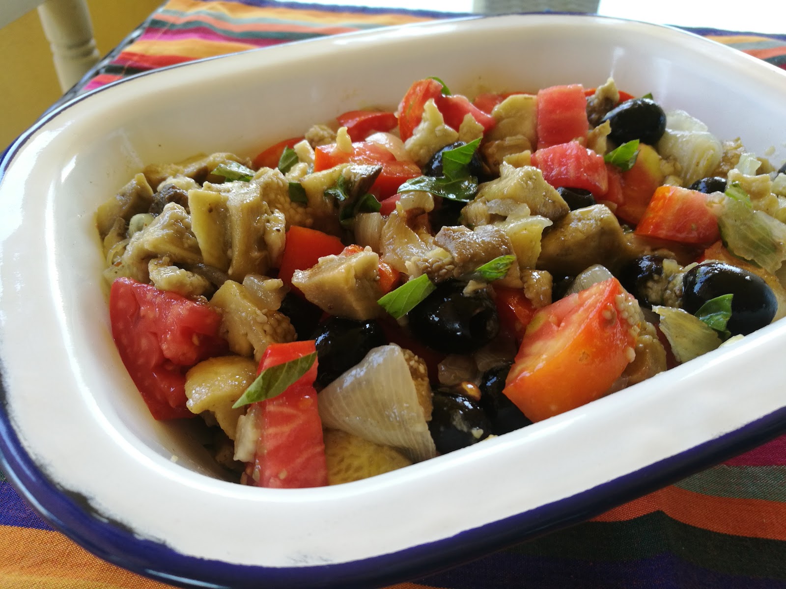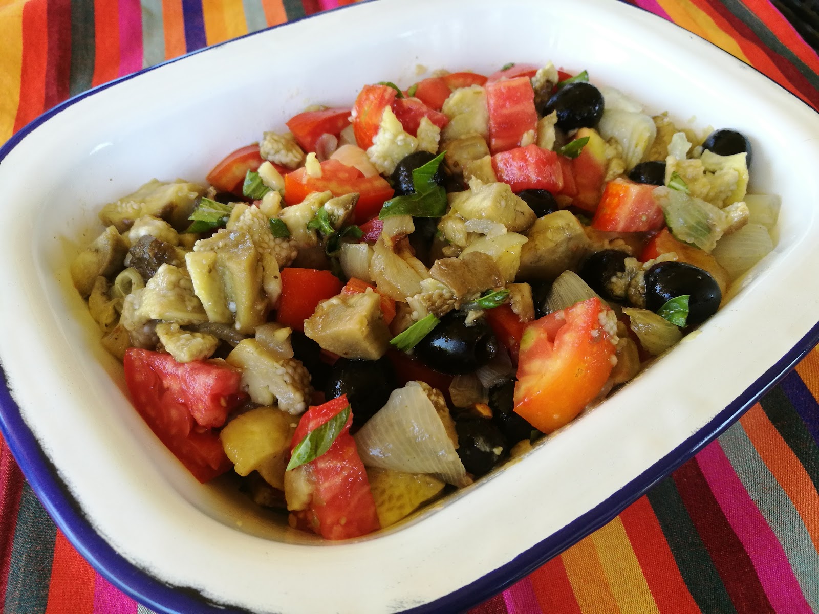– Añadir las berenjenas y cebollas cortados, las aceitunas, y aliñar con un buen AOVE y sal.