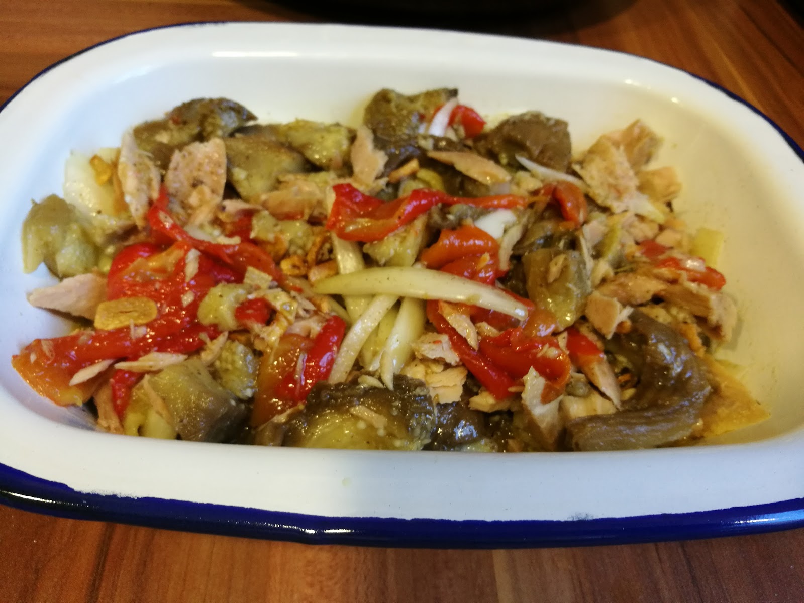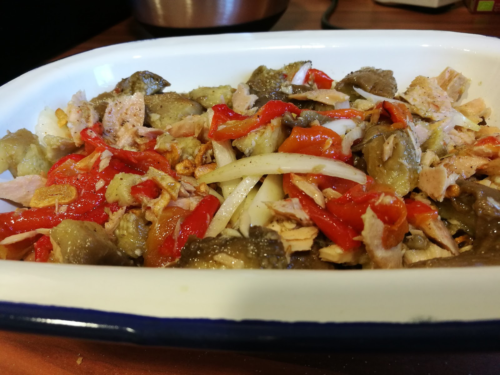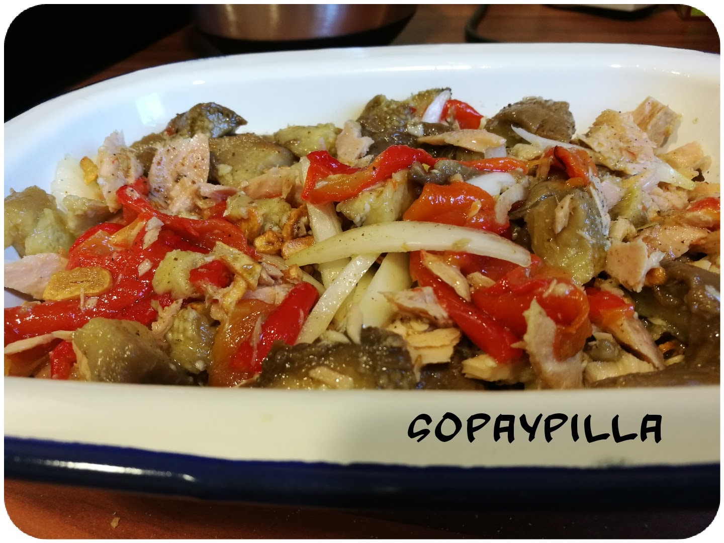– Poner en la SLOW los pimientos y las berenjenas pincelados con aceite y los ajos pelados. Dejar cocer 4 horas en ALTA ( En el horno TRADICIONAL igual, cocerlos a 180º unos 40 minutos.)