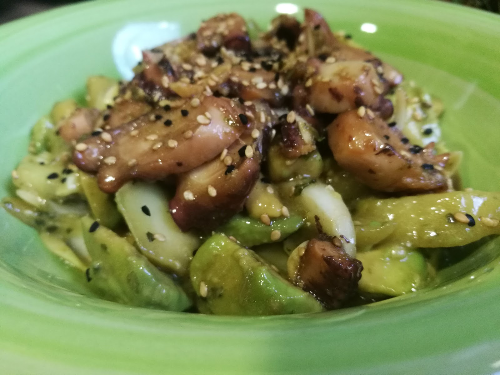 – En un plato hondo, poner el aguacate y encima las rodajas de pulpo, espolvorear sésamo.