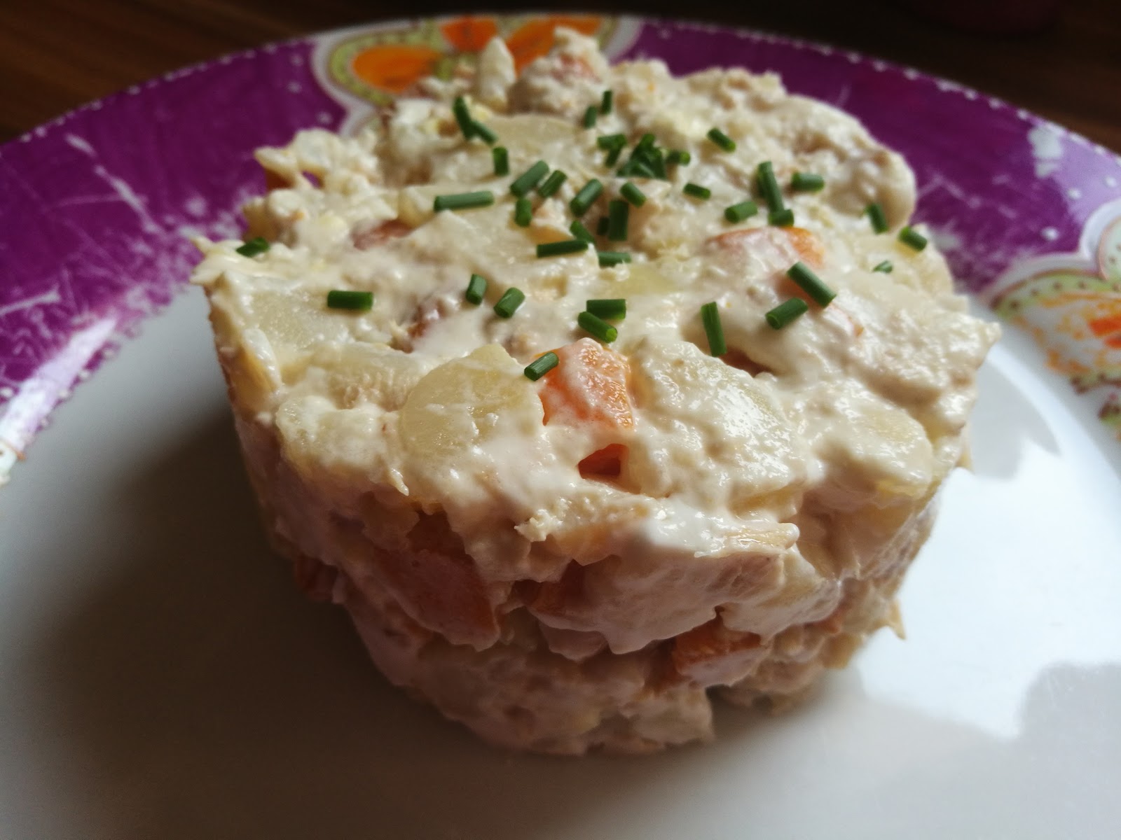 – Una vez terminado, enfriar, pelar y trocear todo, mezclar con el atún y la mayonesa y servir fresquita.