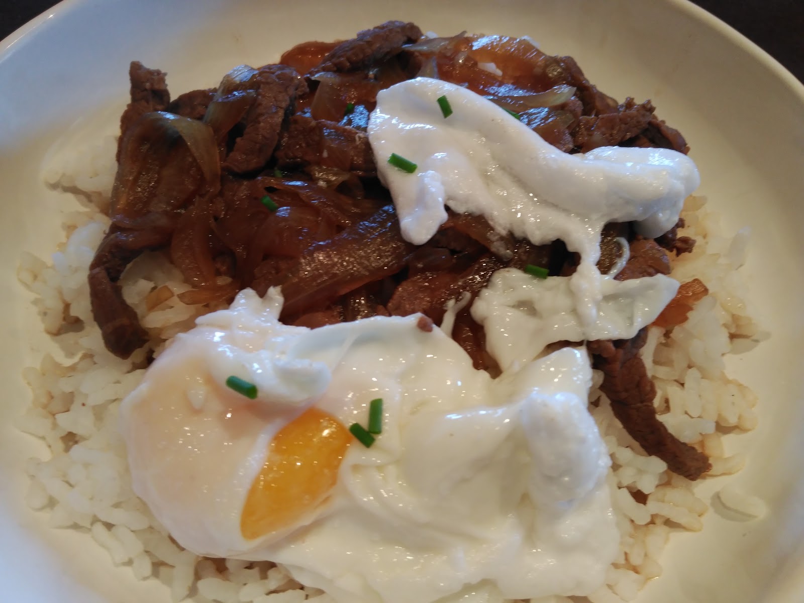 – Servir con el arroz, la ternera y cebolla por encima, y el huevo escalfado. Espolvorear cebollino.