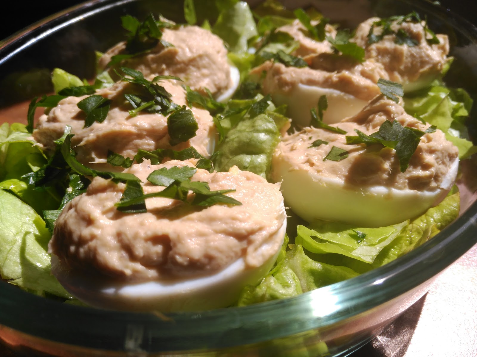 – Colocamos los huevos rellenos con la mezcla que hemos preparado y espolvoreamos el perejil picado.