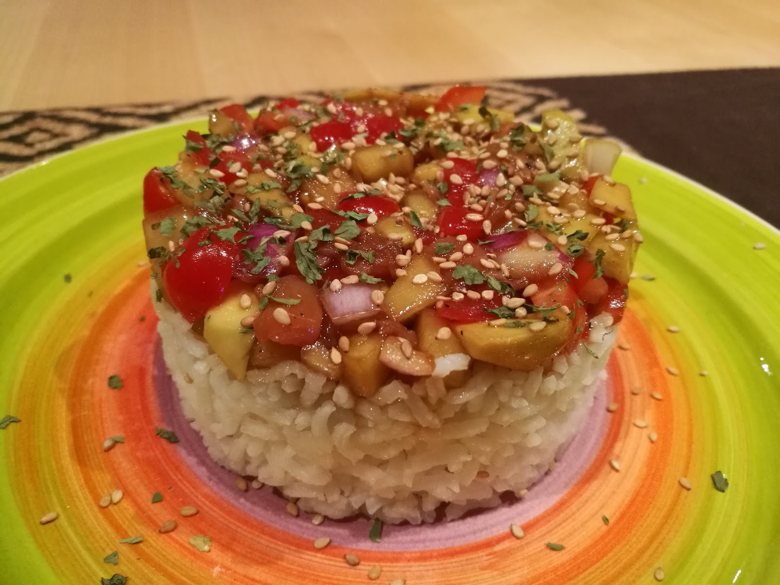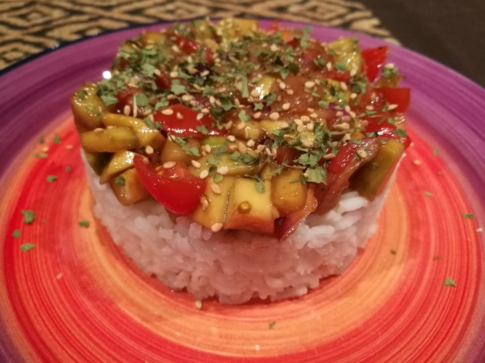 – Con un aro de emplatar, ponemos el arroz y lo cubrimos con las verduras. Espolvoreamos el sésamo y servimos.