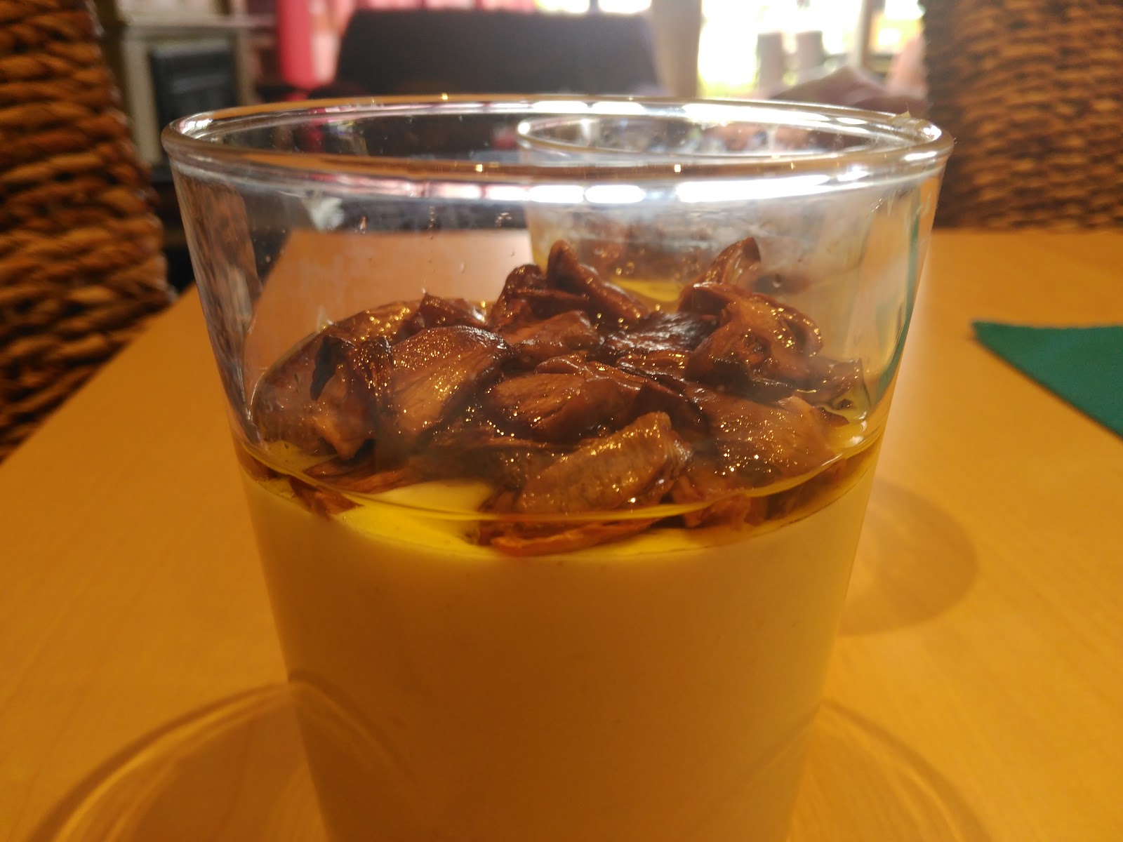 – Servimos el parmentier en vasos, y repartimos los boletus por encima, con sus ajitos y un poco del aceite. A disfrutar!