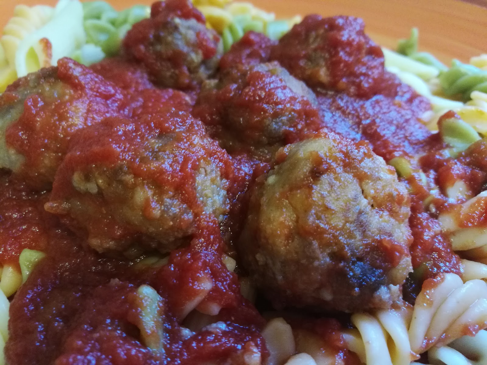 – Servir la pasta, encima la salsa casera y encima las albóndigas…A cenar!!