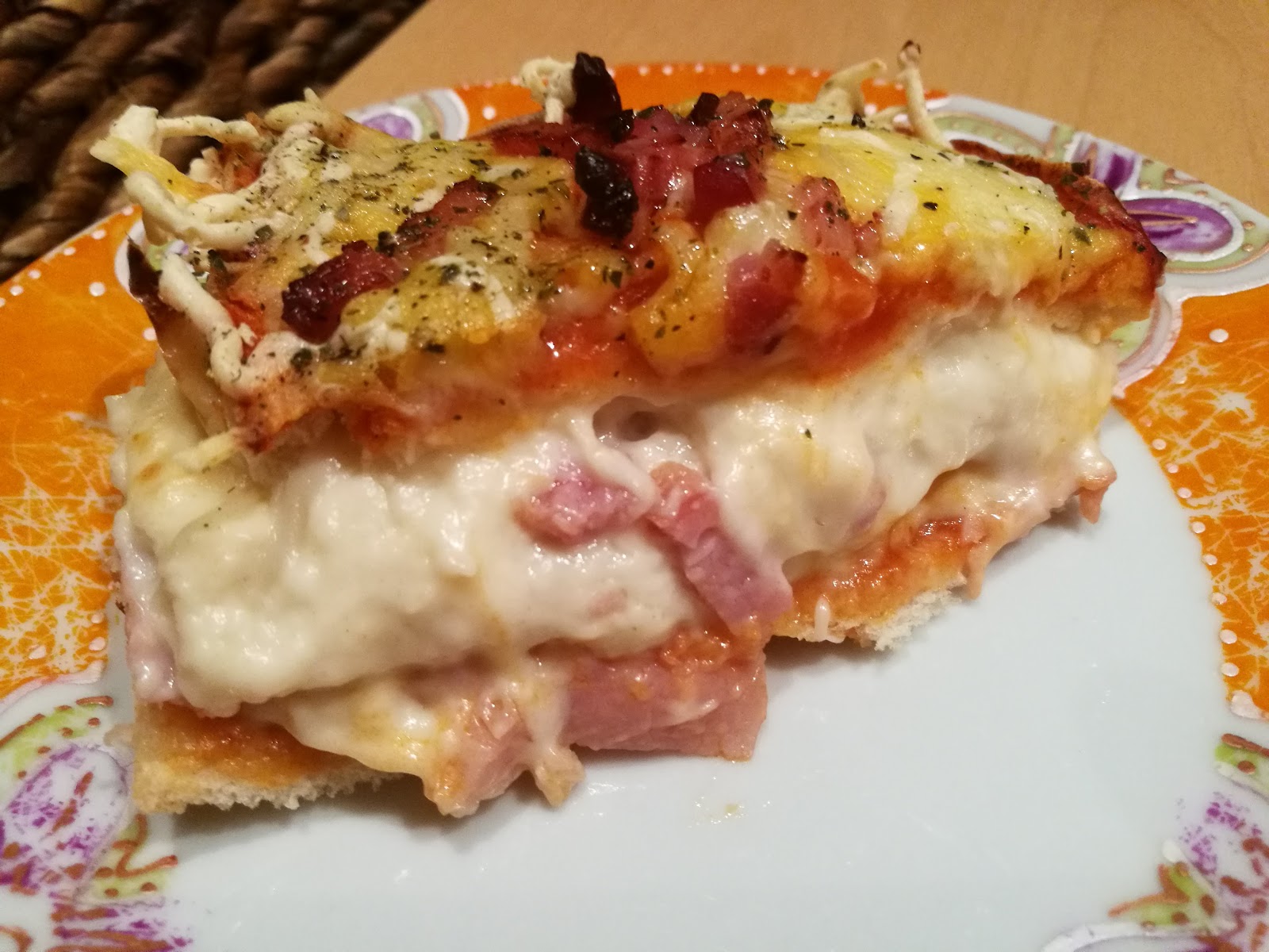 – Ahora ponemos el jamón, bechamel y bacon. Repetir capas hasta acabar con pan. Espolvorear el queso rallado, bacon y orégano.