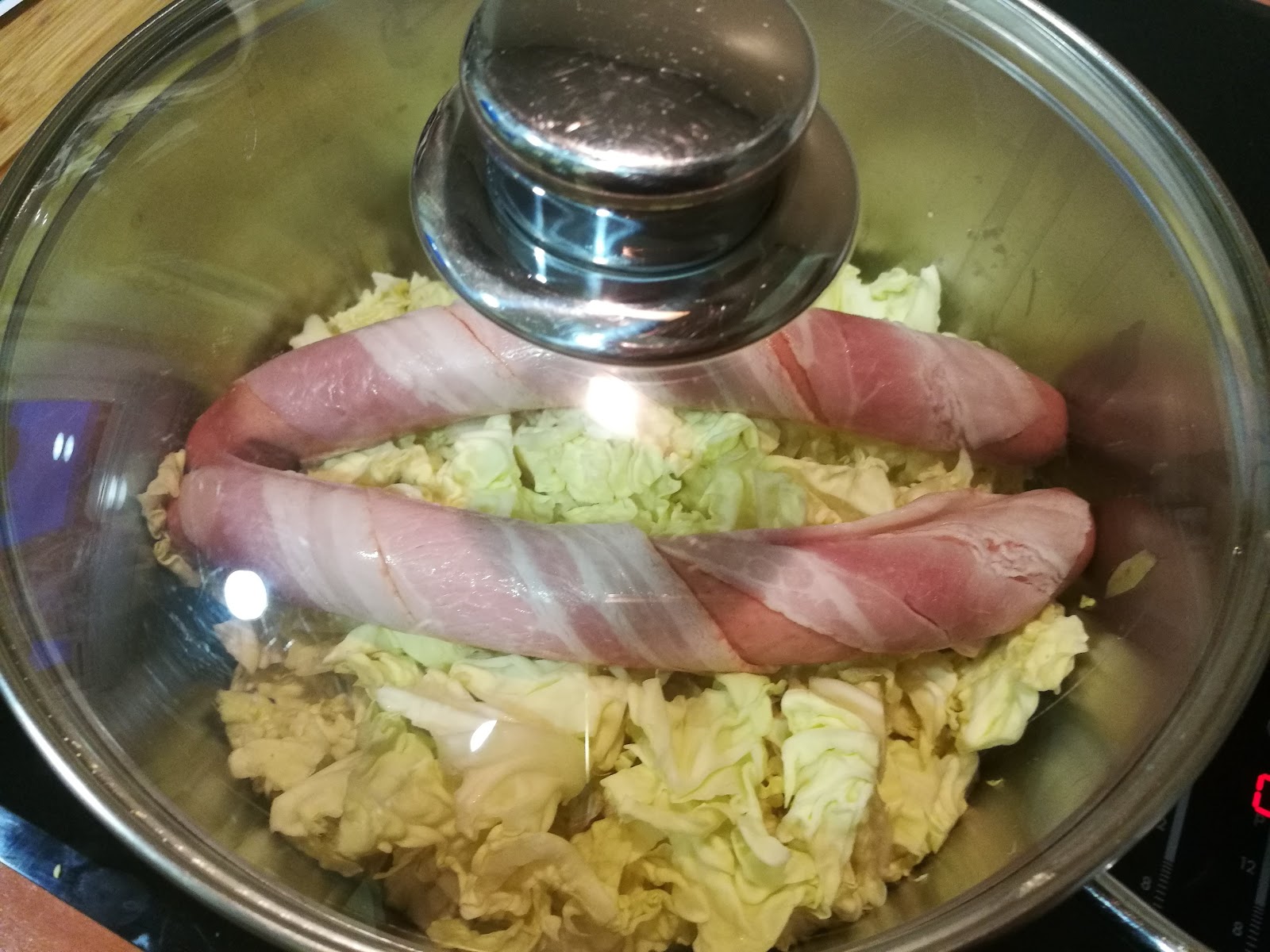 – Enrollar las salchichas con el bacon, y colocarlas encima de la col