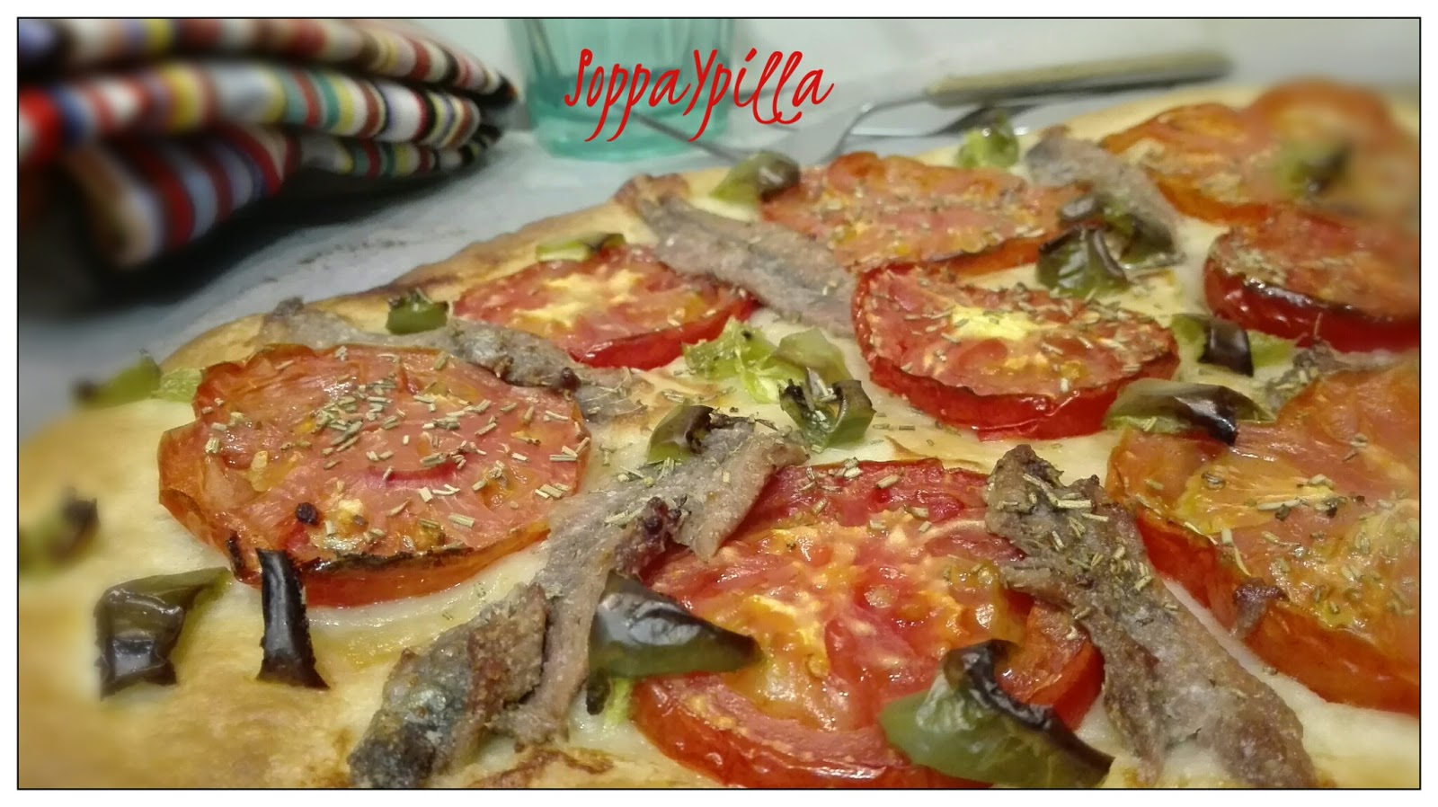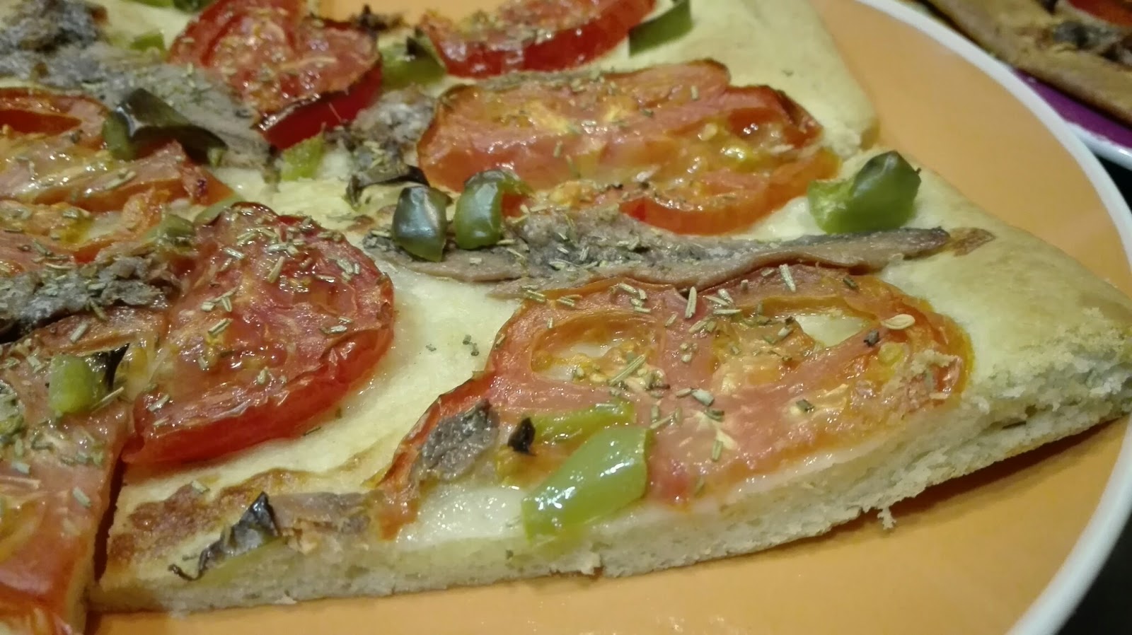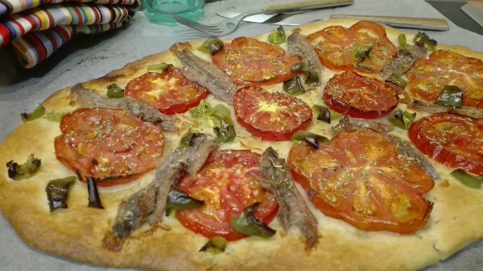 – Distribuir por encima el tomate, las anchoas, el pimiento cortadito, espolvorear con más oregano y echar un chorro de aceite. Meter en el horno unos 20/25 minutos.