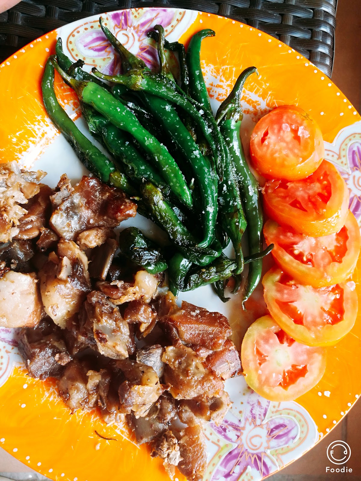 – En una sartén con poco aceite, doramos los pimientos y los ponemos junto a la carne espolvoreando sal en escamas
