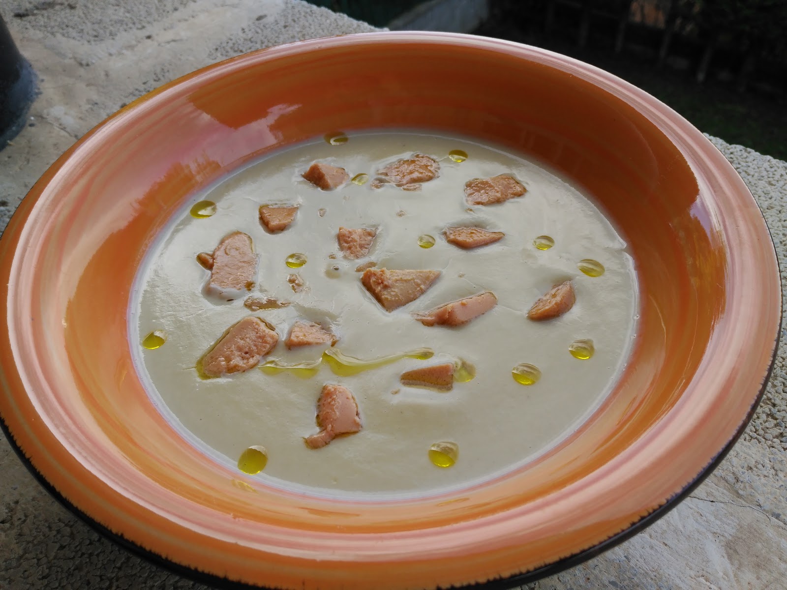 – Servir la crema y partir el foie a trocitos, repatirlo sobre la crema, y poner unas gotitas de aceite.