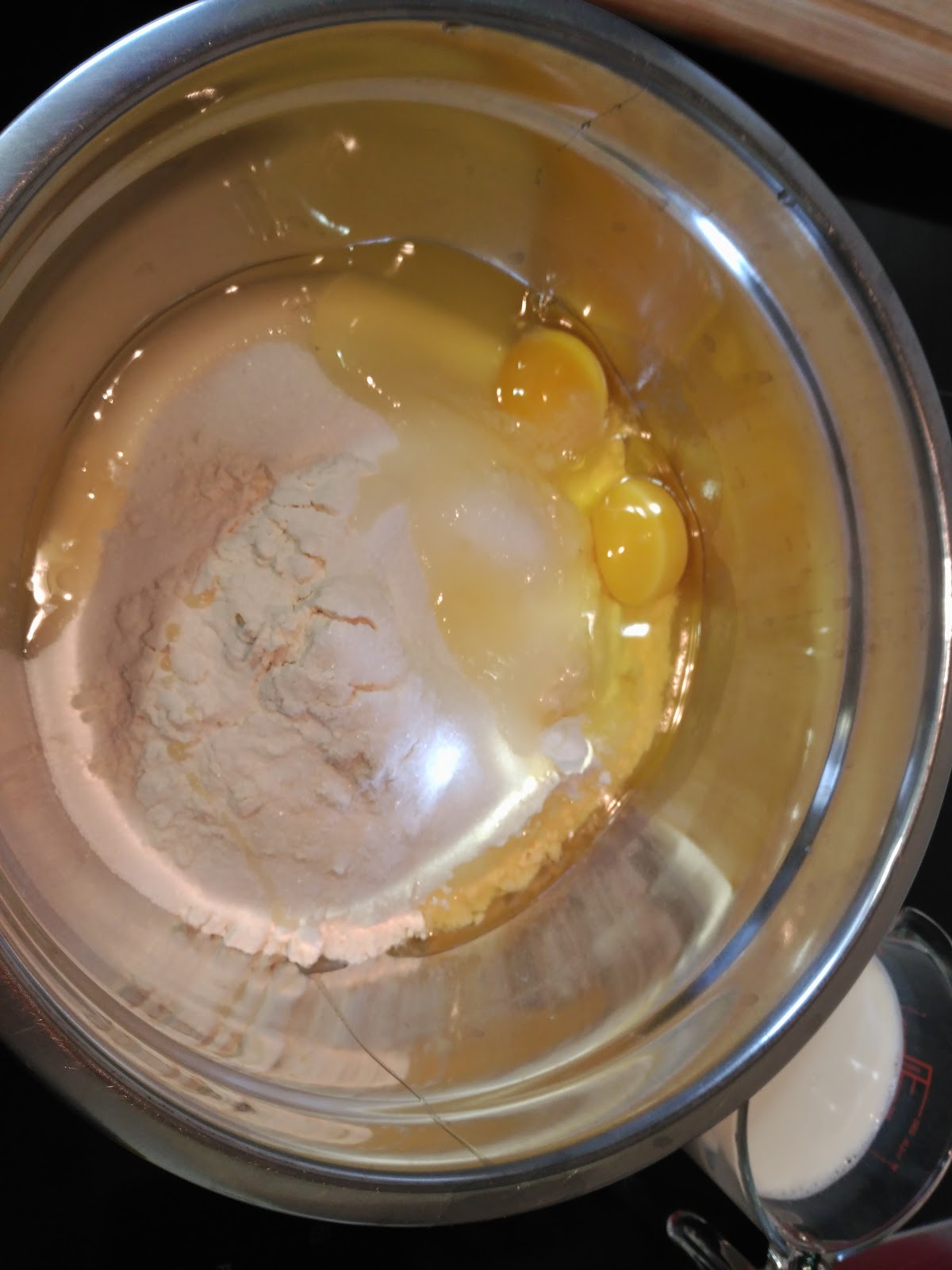 – En un bol, mezclamos la harina, los huevos, el azúcar y la leche con la levadura. Mezclamos y amasamos. Tapamos la masa y la dejamos reposar 20 minutos.