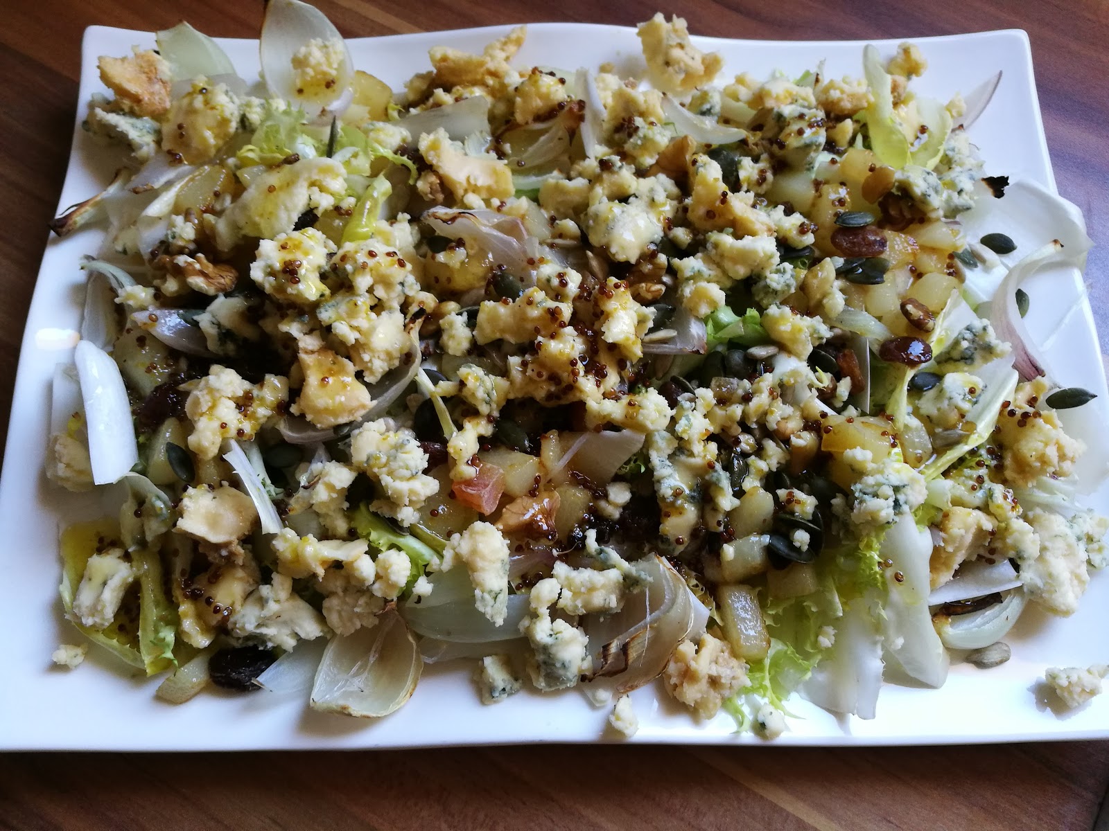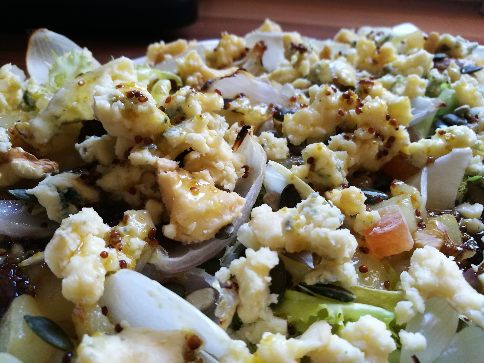 – Repartir las peras, la cebolla, las nueces y el queso desmigado con las manos