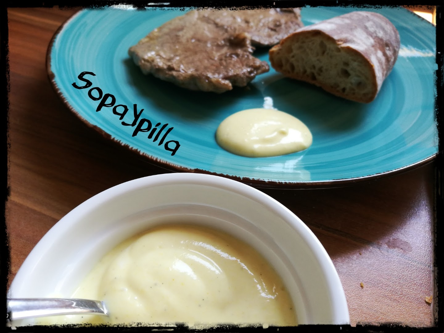 Ajo sí lleva, pero aceite…nadita!! supercurioso el sabor de este falso allioli, sin aceite pero muy sabroso, con petit suisse!! venga…os dejo la recetita…