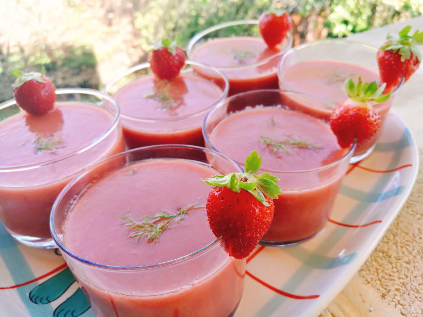 – Salpimentamos, añadimos agua hasta obtener la textura que queramos (en mi caso 400g.) y servimos decorando con las hojas de hinojo y alguna fresa