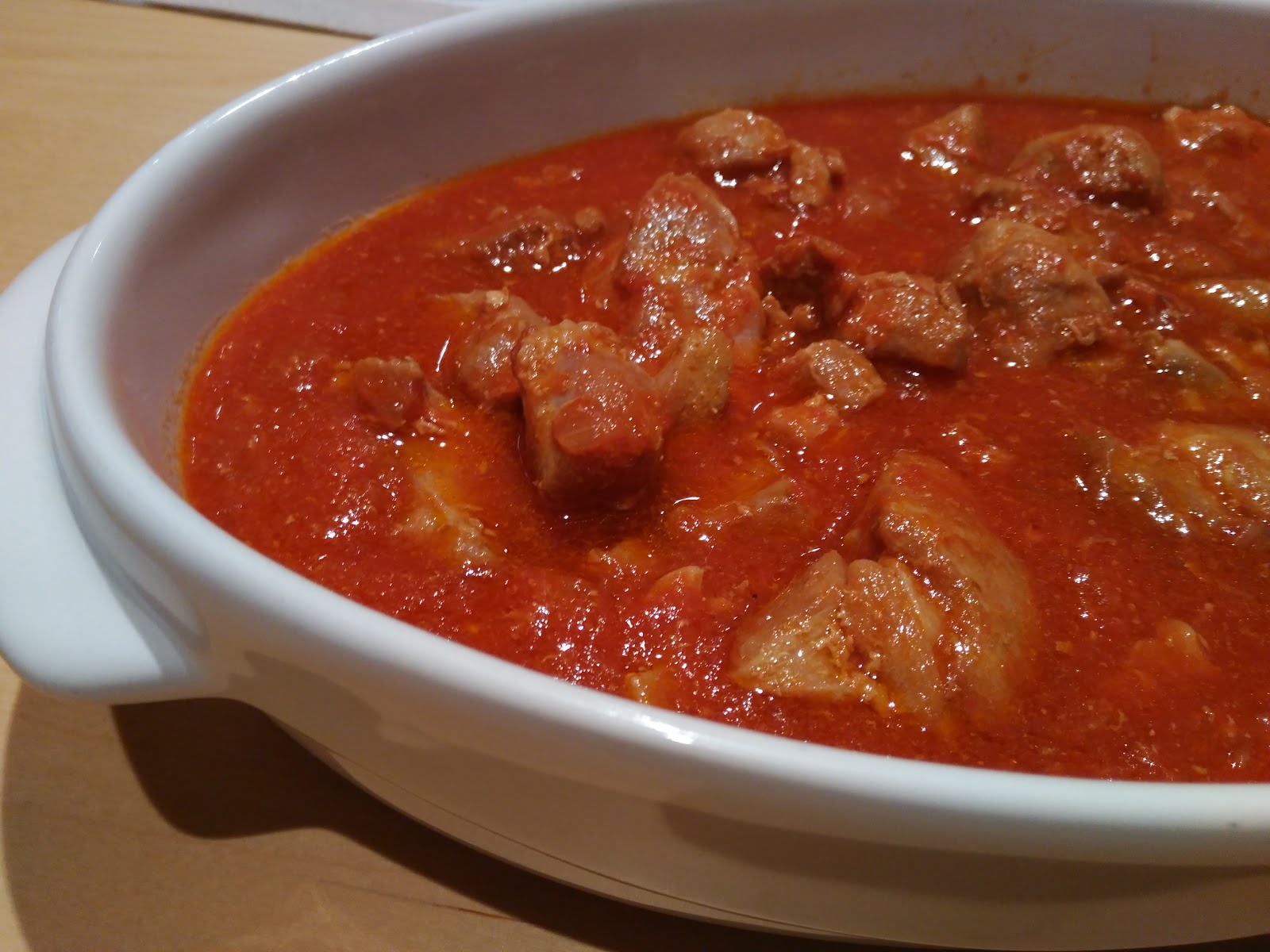 – Cuando estén ya un poco hechos, añadimos el tomate, salpimentamos, bajamos el fuego al mínimo y dejamos cocer 2 horas, removiendo de vez en cuando. La salsita no tiene precio y la carne…ummm jugosita.