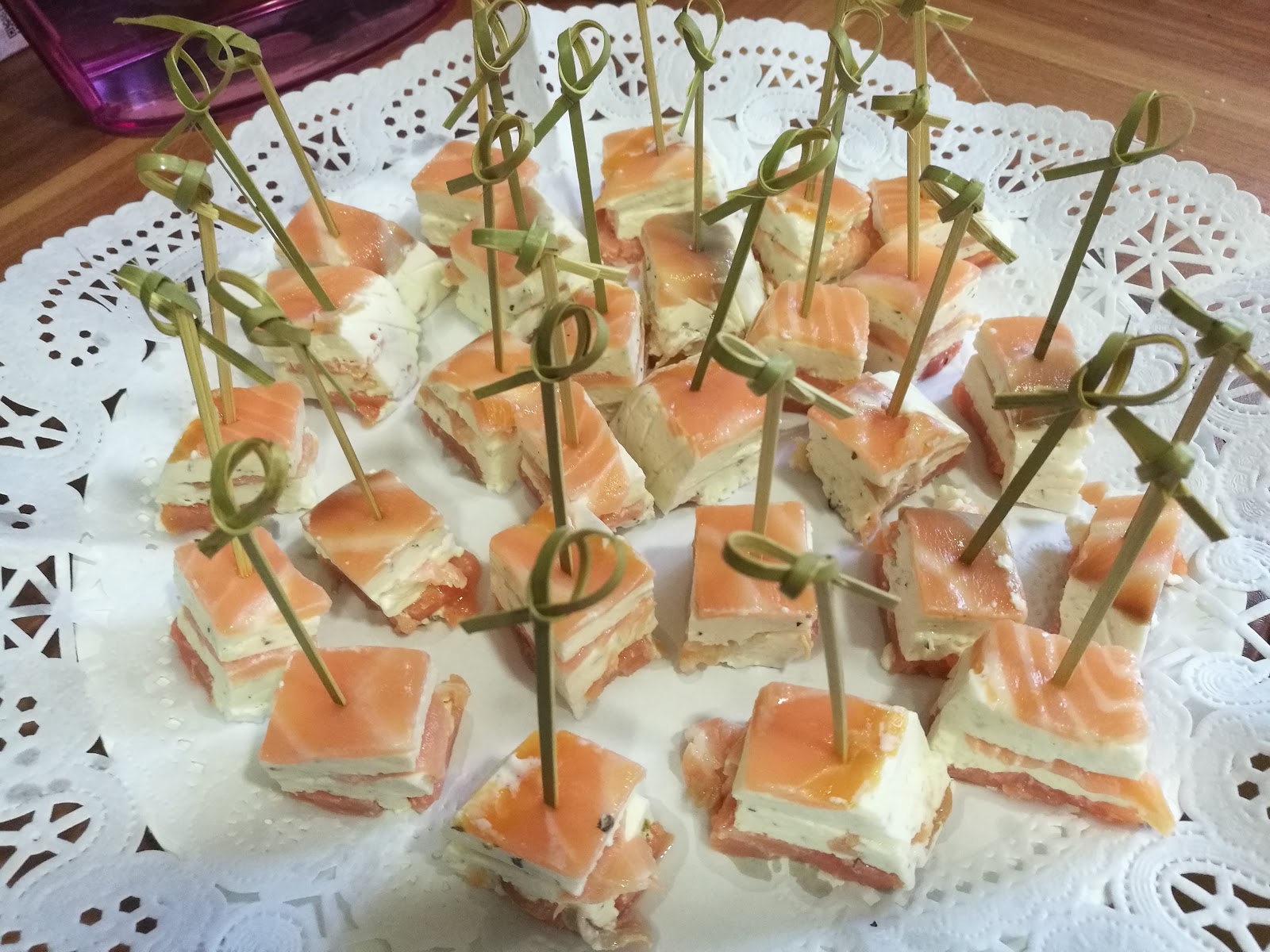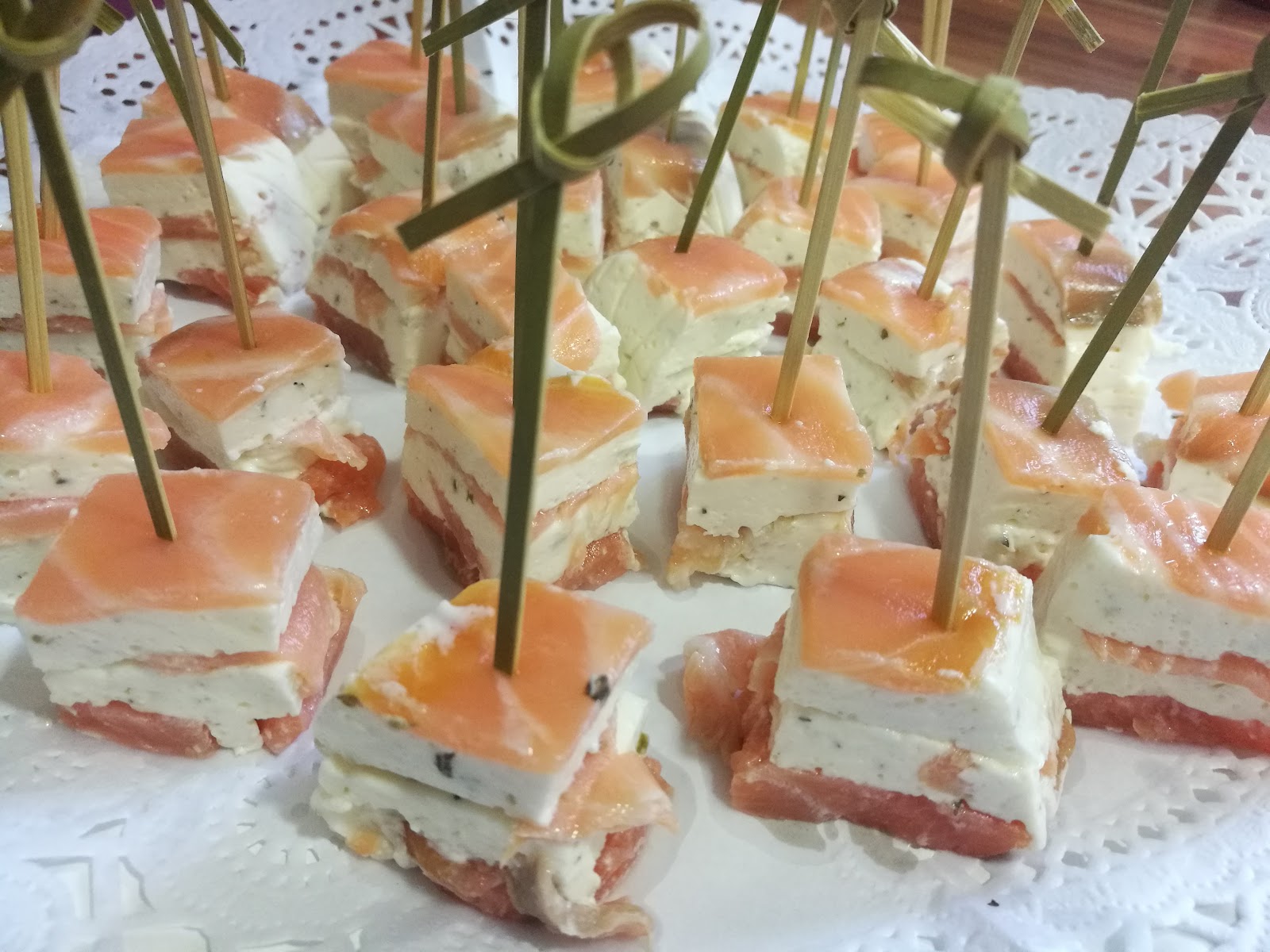 – Volcamos la mitad de la mezcla de queso, y ponemos otra capa de salmón, repetimos capa de queso y acabamos con salmón.