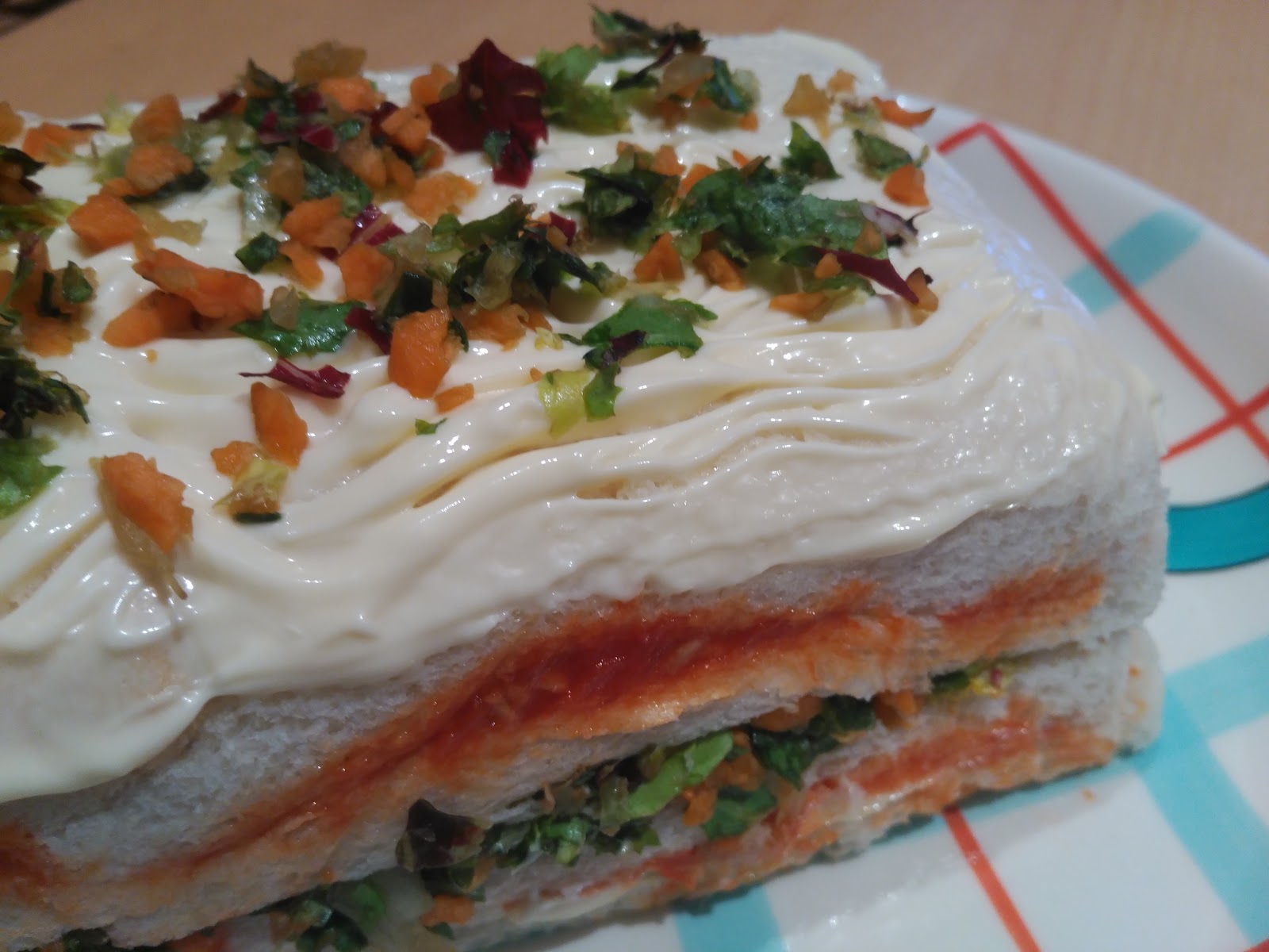 – Ponemos otra capa de pan de molde, y esta vez lo cubrimos con la lechuga y la zanahoria rallada, y los huevos a rodajas o picados
