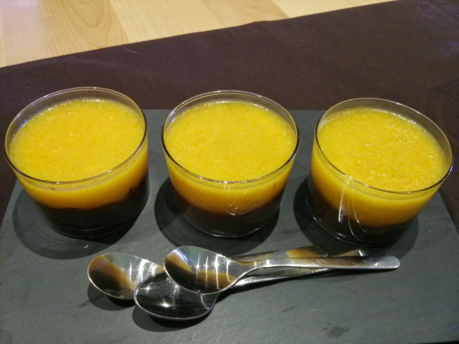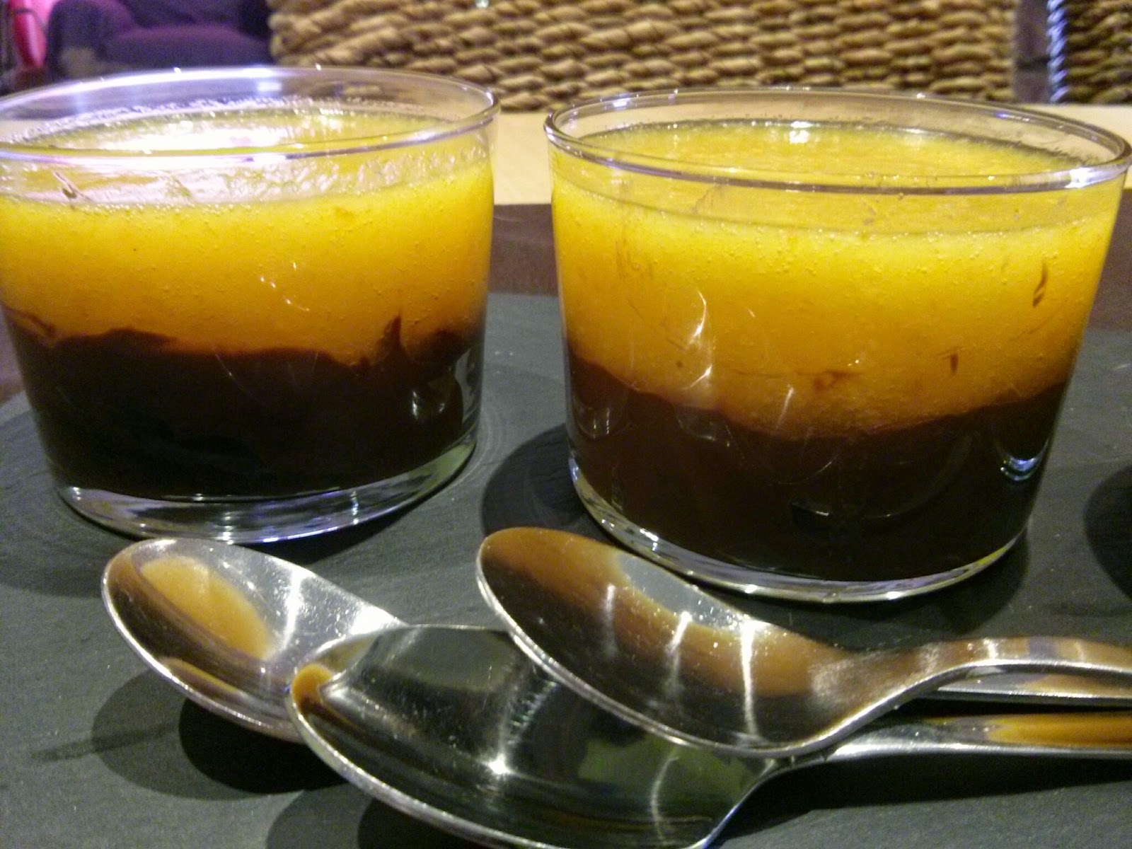 – Poner el chocolate en vasitos (no intentéis un molde, imposible desmoldar) y cubrir con la crema de naranja, podéis espolvorear cacao, yo no tenia.jiji
