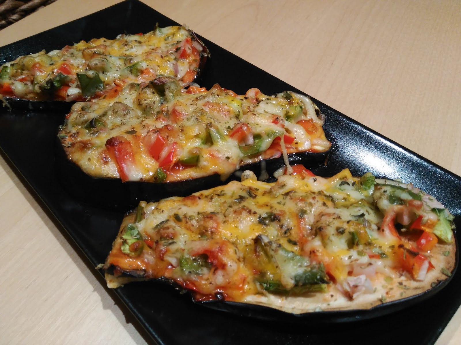 – Cortamos las berenjenas longitudinalmente, no muy finas, y colocamos las lonchas en una bandeja para horno, que serán nuestra base de pizza.