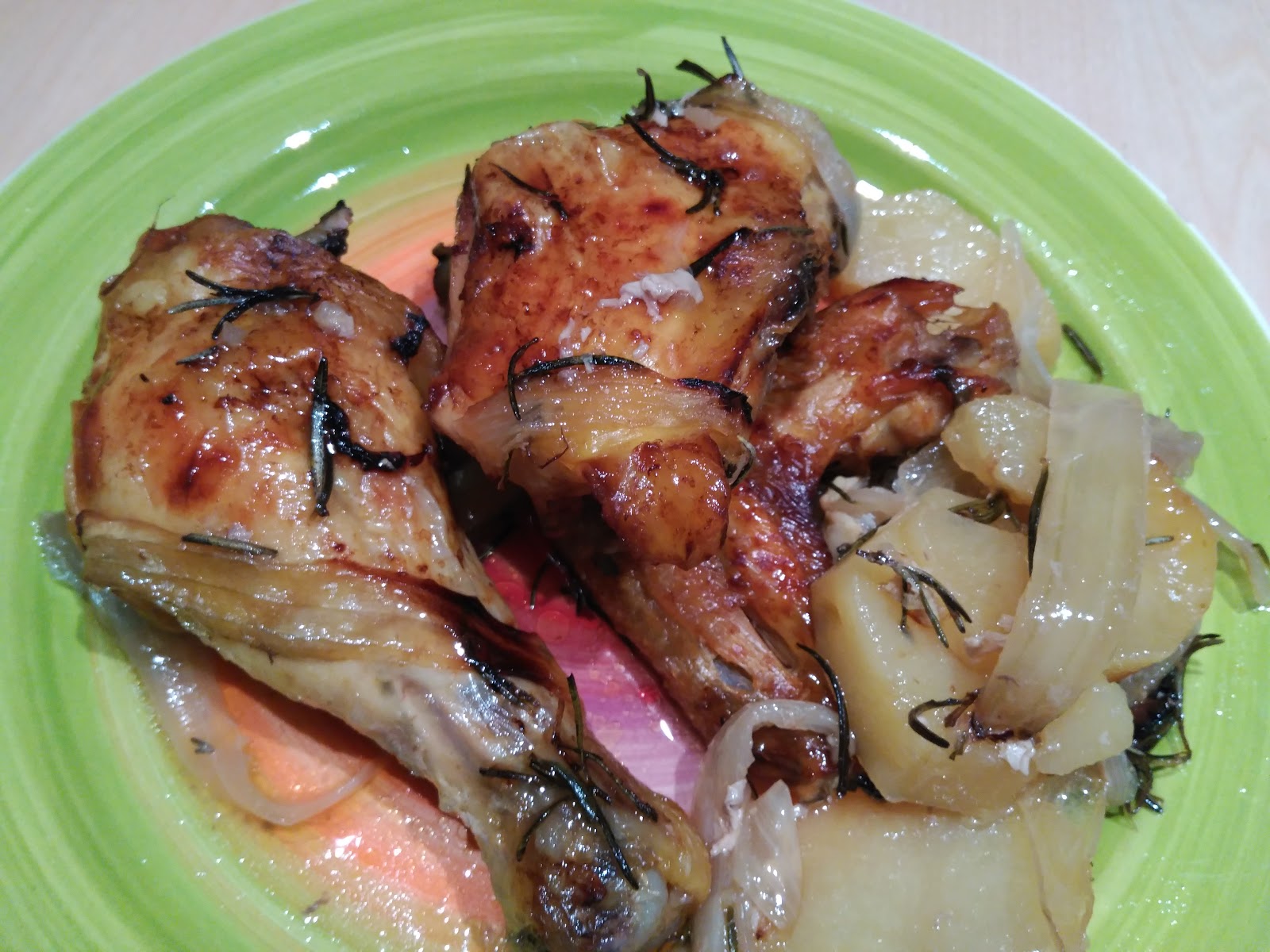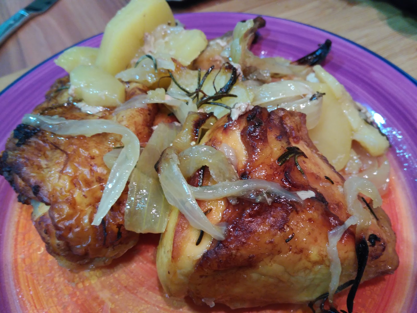 – Hacer una cama de patatas cortadas a rodajas en la bandeja donde vamos a hornear el pollo.