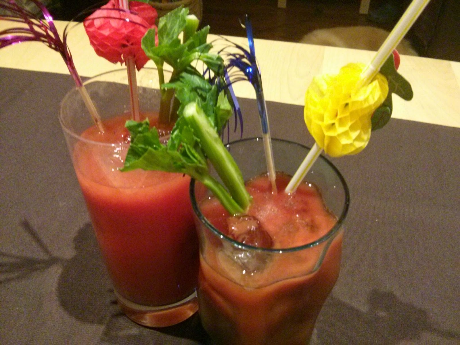 –Directamente en el vaso o en una coctelera, poner en este orden: hielo, ginebra (al gusto, si preferís más cargado o menos, yo puse un dedito) , zumo de tomate (al gusto también, yo llené hasta arriba), la sal y la pimienta, la salsa perrins, el tabasco, remover bien o agitar bien la coctelera y servir.