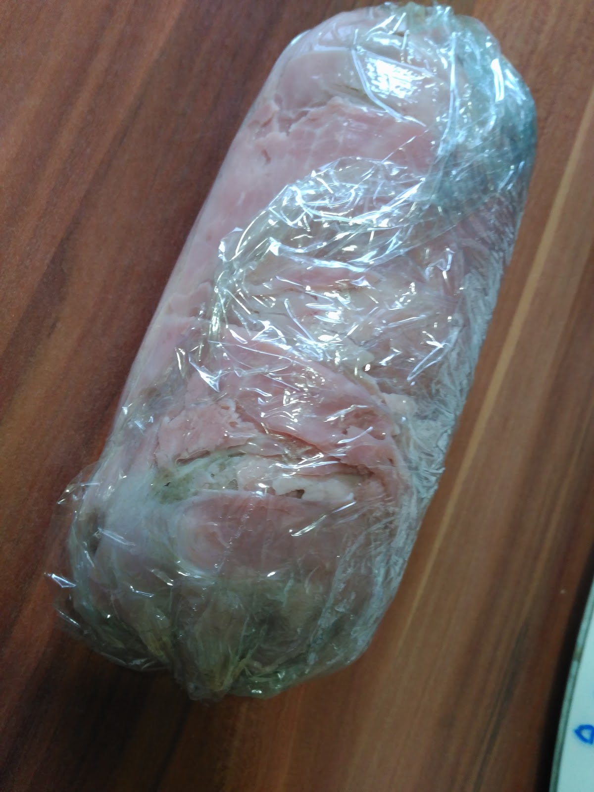 – Extendemos la pasta de champiñones encima del jamón dulce, colocamos el solomillo en el centro, y con ayuda del papel film, enrollamos como si fuera un caramelo, apretando bien. Dejamos el rollito/caramelo en la nevera durante una hora.