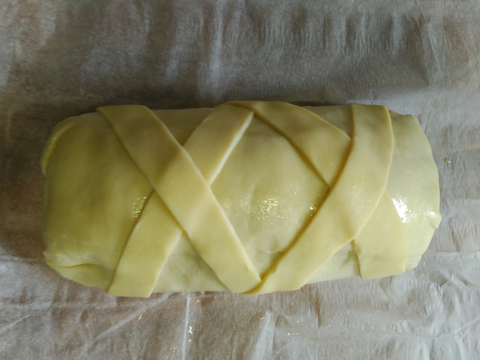 – Pintamos el rollo con huevo batido, colocamos las tiras de adorno y volvemos a pintar con el huevo. Espolvoreamos sésamo y horneamos 30 minutos, tapamos con papel de aluminio y al horno 10 minutos más.