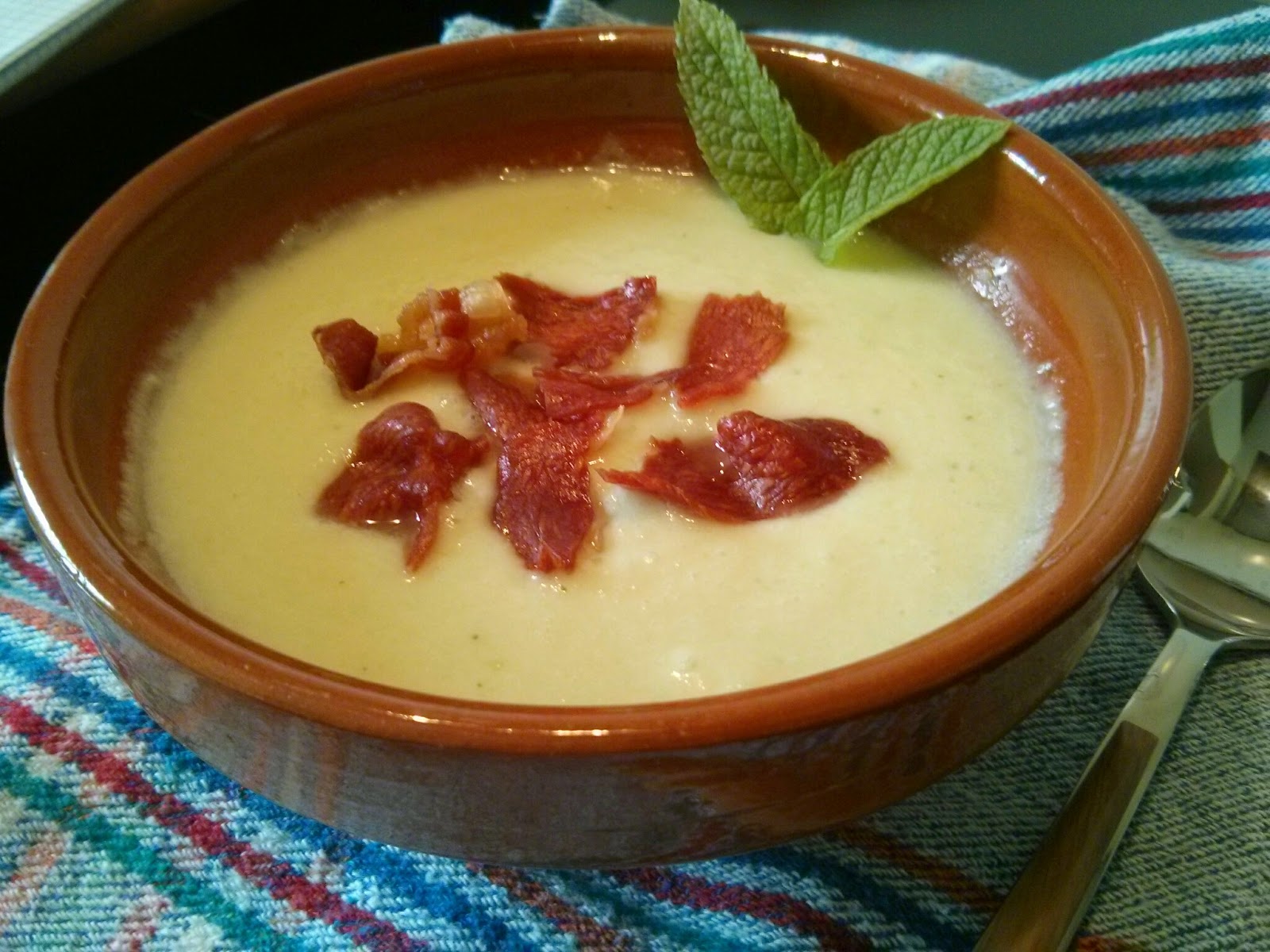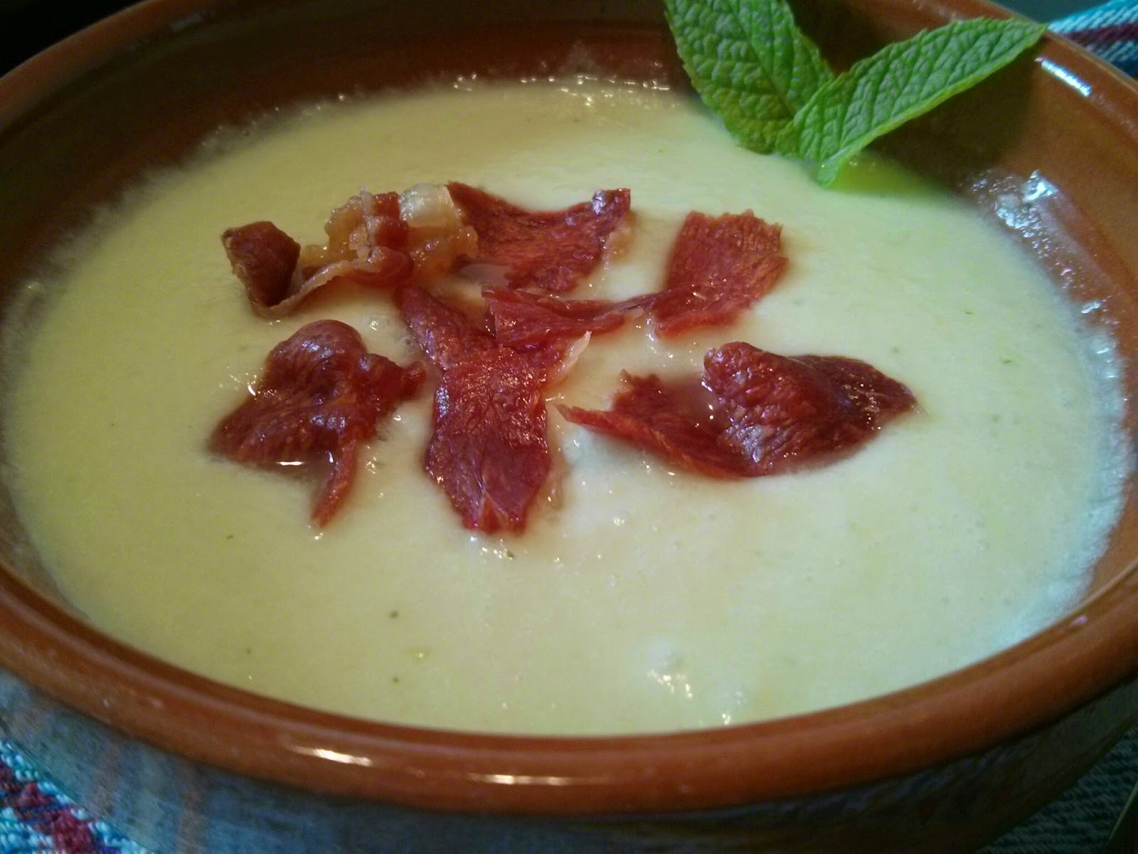 – Triturar todo junto y servir con jamón a taquitos o crujiente de jamón hecho en el microondas (poniendo lonchas de jamón entre dos hojas de papel absorbente de cocina, y al micro potencia máxima 3/4 minutos)