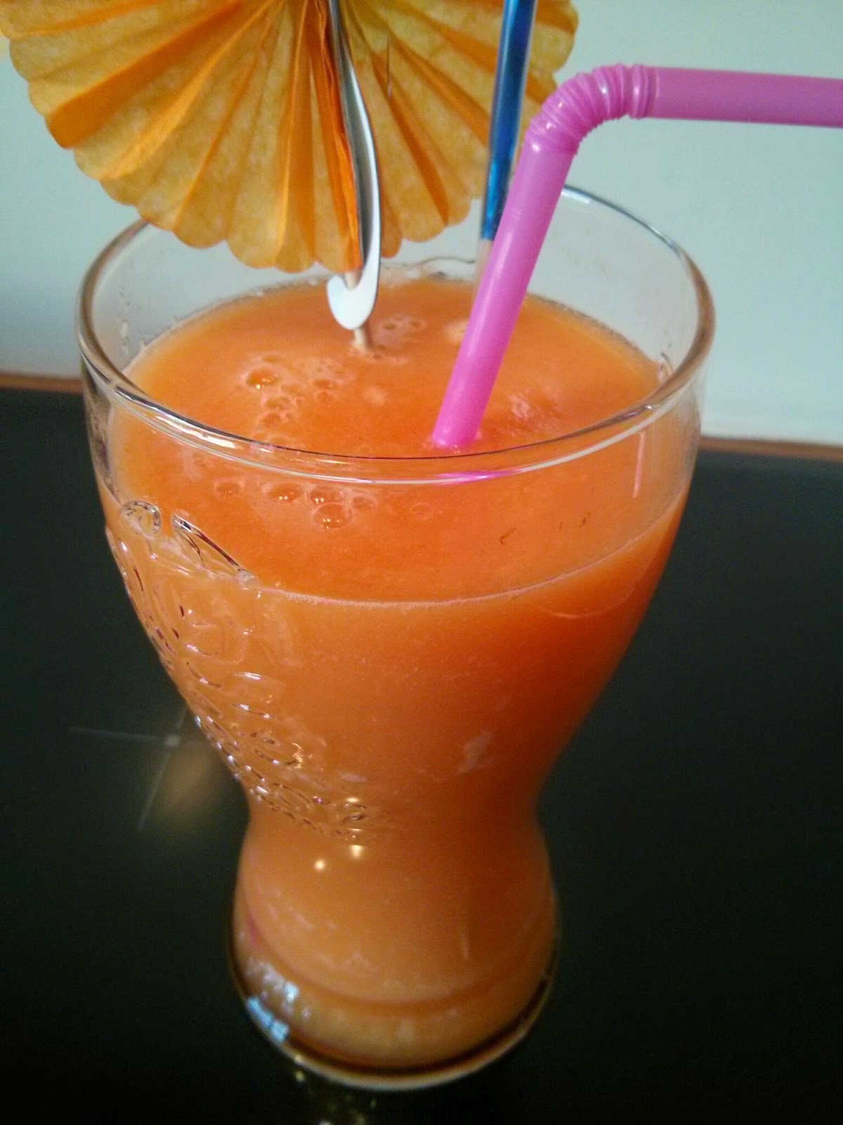 Bébetelo rápido que se escapan las vitaminas! jajaja Delicioso zumo, y vitamínico a tope. Voy a hacer un montón de zumitos, a ver si así tomamos más fruta y menos azúcar.